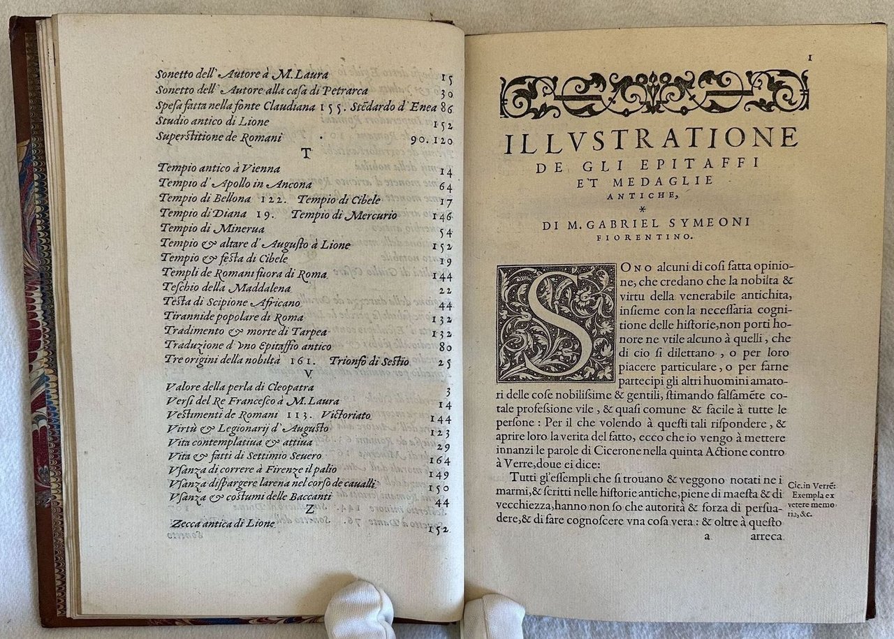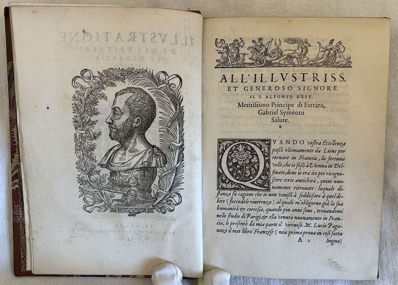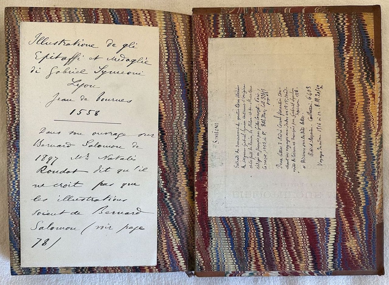 Prima edizione in lingua italiana del 1558 di questa splendida opera sugli epitaffi e le medaglie raccolte dall'autore durante i suoi viaggi in Italia, lo storico e astronomo fiorentino Gabriel Simoni (1509-1576). Stampata a Lione, è una delle edizioni più belle stampate da Jean de Tournes "L'ingéniosité de la mise en pages est tout à fait remarquable" (Brun, 294) Contemporaneamente a questa edizione venne pubblicata alcune settimane prima la versione francese che omise parte del testo e 17 illustrazioni. Dedica ad Alfonso D'este Principe di Ferrara. Frontespizio architetonico, ritratto dell'autore al verso del frontespizio e 68 finissime incisioni di medaglie, epitaffi e i dodici segni dello Zodiaco, molte attribuite all'incisore Bernard Salomon. Adams, Rawles and Saunders F.525; Cartier, De Tournes 419; Censimento 16 CNCE 35000; Dekesel S157 Français. L'opera è in un volume ed è completa. Due fogli con antiche note manoscritte sull'opera uno dei quali incollato al piatto posteriore. Sguardie marmorizzate. Tagli dorati. In ottime condizioni. Copertina in mezza pelle con titolo e decorazioni in oro al dorso in buone condizioni generali con lievi usure ai margini e dorso. Legatura in buone condizioni. Pagine in ottime condizioni con rare fioriture.In 8. cm 21x15. Pp. (8)+174+(1). First edition in 1558 of this wonderful work about epytaphs and medals collected by the author during his travels in Italy, the hystorian and atsronomer from Florence Gabriel Simoni (1509-1576). Published in Lyon, is one of the most beautiful editions published by Jean de Tournes "L'ingéniosité de la mise en pages est tout à fait remarquable" (Brun, 294) Contemporary to this edition, some weeks before was published the first french version which omitted part of the text and 17 illustrations. Dedication to Alfonso D'este Prince of Ferrara. Architectural title page, portrait of the author in the verso of title page and 68 very fine engravings of medals, epytaphs and twelve signs of Zodiac, many of them attributed to the engraver Bernard Salomon. Adams, Rawles and Saunders F.525; Cartier, De Tournes 419; Censimento 16 CNCE 35000; Dekesel S157 Français. The work is in one volume and it si complete Two pages with some handwritten notes, one of them attached in the back counterplate. Marbleed endpages. Gilted external edges pf pages. In very good conditions. Half leather cover with gilted title and decorations in the spine in good conditions lightly worn in the extremities. Binding in good conditions. Pages in very good conditions with occasional foxing. In 8. cm 21x15. Pp. (8)+174+(1).