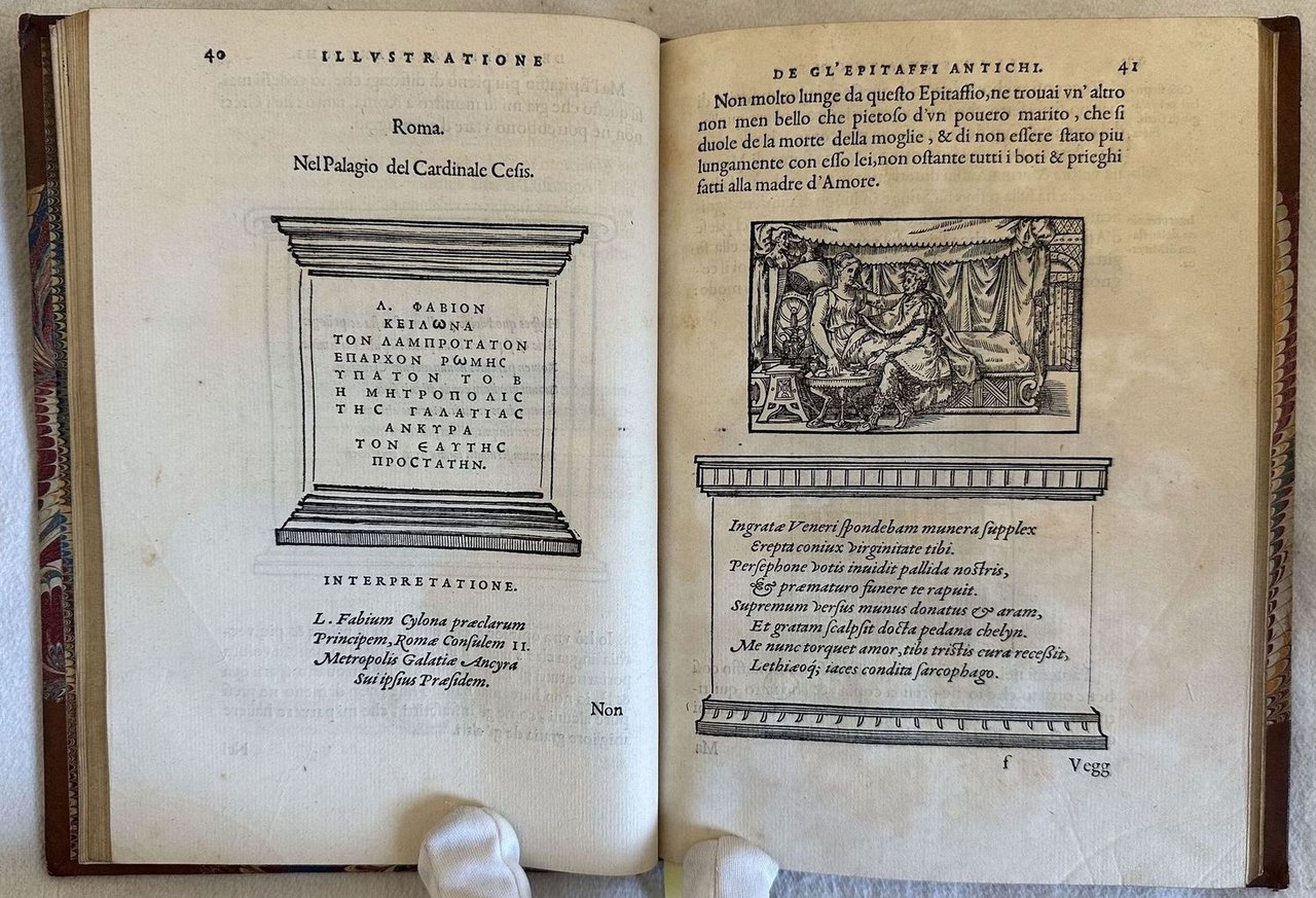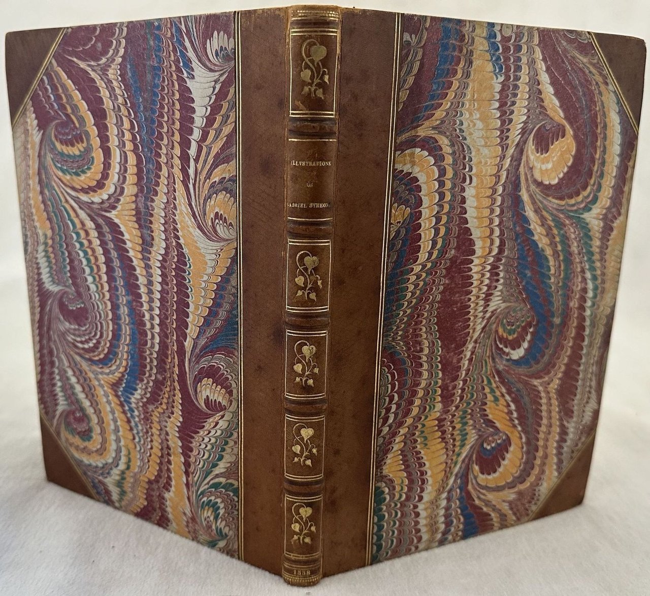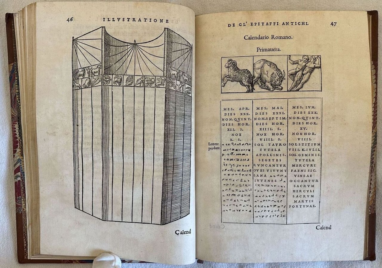 Prima edizione in lingua italiana del 1558 di questa splendida opera sugli epitaffi e le medaglie raccolte dall'autore durante i suoi viaggi in Italia, lo storico e astronomo fiorentino Gabriel Simoni (1509-1576). Stampata a Lione, è una delle edizioni più belle stampate da Jean de Tournes "L'ingéniosité de la mise en pages est tout à fait remarquable" (Brun, 294) Contemporaneamente a questa edizione venne pubblicata alcune settimane prima la versione francese che omise parte del testo e 17 illustrazioni. Dedica ad Alfonso D'este Principe di Ferrara. Frontespizio architetonico, ritratto dell'autore al verso del frontespizio e 68 finissime incisioni di medaglie, epitaffi e i dodici segni dello Zodiaco, molte attribuite all'incisore Bernard Salomon. Adams, Rawles and Saunders F.525; Cartier, De Tournes 419; Censimento 16 CNCE 35000; Dekesel S157 Français. L'opera è in un volume ed è completa. Due fogli con antiche note manoscritte sull'opera uno dei quali incollato al piatto posteriore. Sguardie marmorizzate. Tagli dorati. In ottime condizioni. Copertina in mezza pelle con titolo e decorazioni in oro al dorso in buone condizioni generali con lievi usure ai margini e dorso. Legatura in buone condizioni. Pagine in ottime condizioni con rare fioriture.In 8. cm 21x15. Pp. (8)+174+(1). First edition in 1558 of this wonderful work about epytaphs and medals collected by the author during his travels in Italy, the hystorian and atsronomer from Florence Gabriel Simoni (1509-1576). Published in Lyon, is one of the most beautiful editions published by Jean de Tournes "L'ingéniosité de la mise en pages est tout à fait remarquable" (Brun, 294) Contemporary to this edition, some weeks before was published the first french version which omitted part of the text and 17 illustrations. Dedication to Alfonso D'este Prince of Ferrara. Architectural title page, portrait of the author in the verso of title page and 68 very fine engravings of medals, epytaphs and twelve signs of Zodiac, many of them attributed to the engraver Bernard Salomon. Adams, Rawles and Saunders F.525; Cartier, De Tournes 419; Censimento 16 CNCE 35000; Dekesel S157 Français. The work is in one volume and it si complete Two pages with some handwritten notes, one of them attached in the back counterplate. Marbleed endpages. Gilted external edges pf pages. In very good conditions. Half leather cover with gilted title and decorations in the spine in good conditions lightly worn in the extremities. Binding in good conditions. Pages in very good conditions with occasional foxing. In 8. cm 21x15. Pp. (8)+174+(1).