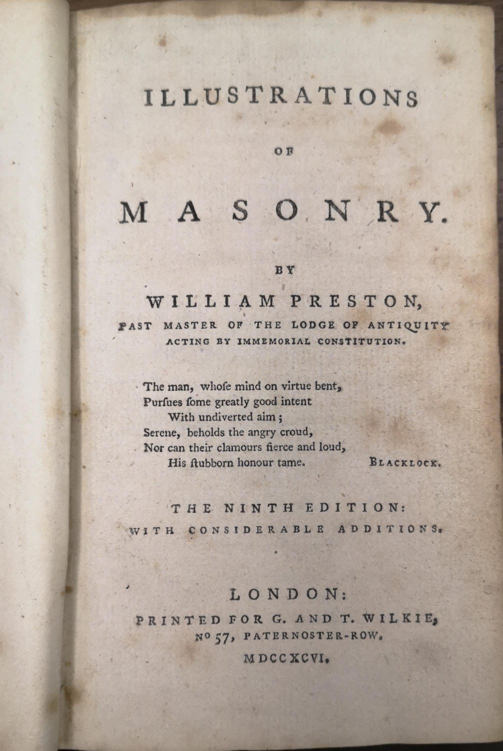 In-16 p. (mm. 165x100), bella legatura in piena pelle coeva, simboli massonici entro cornice dorata ai piatti, decorazioni e titolo oro al dorso, dentelles dorate ai risguardi, tagli dorati, pp. XXIV,420. William Preston (7 agosto 1742 1 aprile 1818) è stato un autore, editore e conferenziere scozzese, nato a Edimburgo. Nel 1760 si trasferì a Londra e iniziò una brillante carriera presso lo stampatore William Strahan. Durante questo periodo, a partire dal 1769, Preston divenne assistente del Gran segretario e "tipografo della Società". Ciò gli diede accesso al materiale che successivamente utilizzò in "Illustrations of Masonry". Istituì anche un sistema di lezioni didattiche.. "Illustrations of Masonry", venne pubblicata la prima volta nel 1772 e negli anni seguenti conobbe numerose edizioni. Fu sotto Preston che la Loggia dell'Antichità si separò dalla Gran Loggia dei Moderni diventando per dieci anni La Gran Loggia di tutta l'Inghilterra a sud del fiume Trent'.Esemplare uniformemente arrossato, ma complessivamente ben conservato.