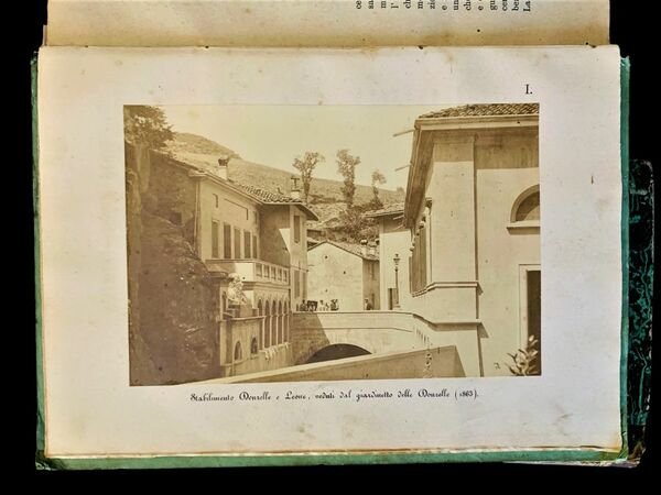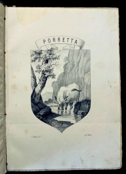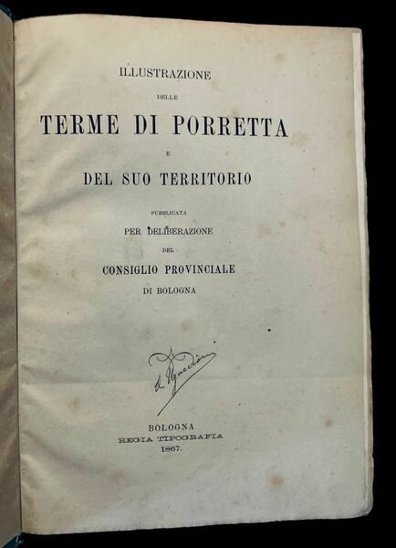 In 4°; VIII, 468; (4) pp. e 18 c. di tav. delle quali 6 con foto allalbumina coeve applicate con magnifici scorci e vedute del celebre paese della provincia bolognese. Legatura editoriale con titolo impresso in nero sul piatto anteriore entro cornice con doppio filetto. Titolo impresso in nero anche al dorso. Piccola ed antica nota ottocentesca di possesso privato al frontespizio. Qualche lieve difetto e mancanza della carta in corrispondenza delle cerniere ma nel complesso in buone-ottime condizioni di conservazione. Allinterno del piatto anteriore ex-libris di proprietà privata. Esemplare con le pagine leggermente ed uniformemente brunite (come tutti gli esemplari conosciuti a causa della qualità della carta utilizzata) ma privo di fioriture e foxing, spesso presenti in numerosi esemplari. Prima edizione di questa celeberrima edizione dedicata alle acque termali di Porretta Terme e alla storia dellIstituto termale. Nel volume sono presenti con articoli dedicati alla geologia, alla fauna, alla topografia del territorio, alle acque termali ed alle loro qualità medico-mineralogiche con articoli di D. Santagata, G. Bianconi, G. Bertoloni, G. Toldi, G. Sgarzi, M. Paolini. 4 tavole litografiche raffigurano i famosi quarzi a tramoggia porrettani, contenenti acqua. La prima tavola fuori testo è quella del bue porrettano che secondo unantica leggenda medioevale, malato, fu lasciato libero dal suo padrone ed andò a dissetarsi presso la sorgente termale. Miracolosamente guarito, il bue ritornò dal suo padrone che iniziò a decantare le qualità miracolose della sorgente di Porretta. In realtà, le terme erano già ben conosciute in epoca romana come dimostrano numerosi rinvenimenti archeologici avvenuti nella zona. In epoca medioevale la zona venne lentamente abbandonata, fino a divenire, quasi disabitata. Nel XII° secolo il territorio di Poretta passa alla diretta dipendenza del Comune di Bologna venendo riscoperto e divenendo meta turistica delle ricche famiglie della città felsinea. E proprio in questo periodo che prende forma il nuovo abitato di Porretta ed anche le prime strutture ricettive del luogo. Dal XV° secolo in poi, il luogo inizia a guadagnare sempre più fama, vedendo fra i suoi visitatori abituali illustri personaggi come Lorenzo il Magnifico, Niccolò Machiavelli, Andrea Mantegna e Gioachino Rossini. Importante opera di storia locale e mineralogia. Prima edizione in buone-ottime condizioni di conservazione completo della brossura editoriale. Rif. Bibl.: Lozzi,II, 3795-3796; IT\ICCU\SBL\0405888.