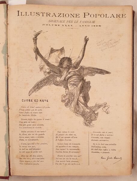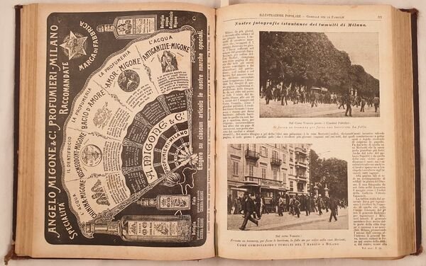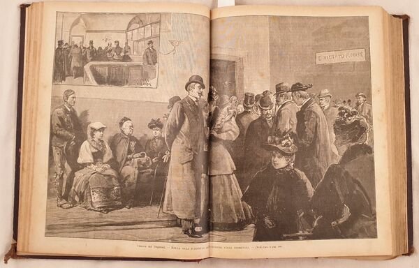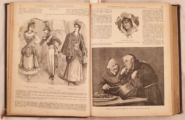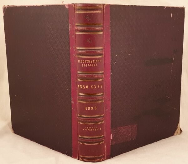 Raccolta completa dell'anno 1898 della rivista per famiglie l'Illustrazione popolare.<BR><BR> <BR><BR>Tra gli articoli presenti: Alfonso Daudet, Il pianoforte della Marchesa, Le commemorazioni patriotiche di Palermo, Vincenzo Maria Sarnelli, Leone Fortis, Alfredo Piatti, Leone XIII, Ricordi del 1848, Mazzini nel 1848, Pellegrino Rossi, Donne di Casa Savoia, La nuova urna di Sant'Ambrogio, una lezione di Silvestro Centofanti, Il giuoco del calcio a Firenze, L'agitazione di Bari pel caro del pane, Giacomo Leopardi e il nostro secolo, La Ss. sindone di Torino, il 1848 a Berlino, Il monumento ossario di Cornuda, Spedizione del Barone de Sceleschi, Re Vittorio Emanuele a Superga, Sordomuti, Del Duca degli Abruzzi col pallone Godard a Torino, Giacomo Leopardi, Nell'arcipelago delle Galapagos di Charles Darwin con illustrazioni, Esposizione d'arte sacra a Torino, <BR><BR>Alcuni romanze e novelle: Mammola di Paolo Mantegazza, Calicanto di Mantegazza, A una bella bambina di Barrili, Le memorie di Don Ramos di Genevay, L'antro di Riccardo Pitteri, Piano e monte di Giovanni Pascoli, <BR><BR>Numerose incisioni nel testo e a piena pagina tra cui Capodanno di Pietro Bouvier, nuova ferrovia Rocchetta Potenza, La nuova università di Napoli, Palermo, il nuovo teatro di Palermo, Costumi di carnevale, Fiori e frutta di Ingegnoli, Torino, Costumi della vita popolare veneziana, agitazione di Bari, Amsterdam, Venezia nel '48 al forte di Marghera ecc.<BR><BR>L'ultimo numero di Natale: A nanna di Giovanni Pascoli, numerosi modelli di bambole ecc. In buone condizioni. Copertina in mezza pelle con titolo e decorazioni in oro al dorso in buone condizioni generali con lievi usure ai margini e dorso. Legatura in buone condizioni. Pagine in ottime condizioni con rare fioriture. Parte mancante a pag. 155. Le pagine da 353 a 368 legate male. Mancanti le pag. da 402 a 416. In folio. Dim. 31,5x24 cm. Pp. 838. Complete collection of the year 1898 of the magazine for the families l'Illustrazione popolare. Between the articles inside: Alfonso Daudet, the piano of Marchesa,patriotic commemorations of Palermo, Vincenzo Maria Sarnelli, Leone Fortis, Alfredo Piatti, Leone XIII, Rememberings of 1848, Mazzini in 1848, Pellegrino Rossi, Donne di Casa Savoia, the new grave of Sant'Ambrogio, a lessons of Silvestro Centofanti, the soccer games in Florence, The riot of Bari for the increase price of bread, Giacomo Leopardi and our century, The Holy Sindone in Turin, il 1848 in Berlin, the bone monument of Cornuda, Expedition of Barone de Sceleschi, Re Vittorio Emanuele a Superga, Sordomuti, Del Duca degli Abruzzi col pallone Godard a Torino, Giacomo Leopardi, in Galapagos Archipelago by Charles Darwin with illustrations, Exposition of Holy Art of Turin, Some novels and short novels: Mammola di Paolo Mantegazza, Calicanto di Mantegazza, A una bella bambina di Barrili, Le memorie di Don Ramos di Genevay, L'antro di Riccardo Pitteri, Piano e monte di Giovanni Pascoli, Different full page and in the text illustrations: Capodanno di Pietro Bouvier, nuova ferrovia Rocchetta Potenza, La nuova università di Napoli, Palermo, il nuovo teatro di Palermo, Costumi di carnevale, Fiori e frutta di Ingegnoli, Torino, Costumi della vita popolare veneziana, agitazione di Bari, Amsterdam, Venezia nel '48 al forte di Marghera ecc. L'ultimo numero di Natale: A nanna di Giovanni Pascoli, numerosi modelli di bambole ecc. In good conditions. Half leather cover with golden title and decorations in the spine in good general conditions slightly worn in the edges and spine. Binding in good conditions. Pages are in very good conditions with occasional foxings. Missing parts in pag. 155. Pages from 353 to 368 are badly bound. Pages from 402 to 416 are missing. In folio. Dim. 31,5x24 cm. Pp. 838.