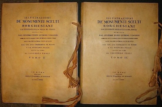 Folio imperiale (cm. 58), 2 Voll.; antiporta f.t. incisa su rame da Pietro Fontana veneto da un disegno di Agostino Tofanelli, IV pp., 1 c.nn., 110 pp. e 48 tavv. a piena pagina; 2 cc.nn., 70 pp. e 32 tavv. Le tavole a pagina intera sono incise su rame da noti artisti contemporanei come, tra gli altri, Luigi Cunego, Gio. Batta Leonetti, Pietro Bettelini, Gio. Brunetti, Giovanni Ottaviani, Angelo Campanella, Pietro Fontana. I disegni sono, in prevalenza, di Agostino Tofanelli, Bernardino Nocchi, Domenico de Angelis, Teodoro Matteini. Splendide legature editoriali in pergamena con titoli in nero al piatto anteriore e al ds. Legacci in pelle. Sguardie in carta decorata. Qualche sporadica fioritura, ma esemplare in eccezionale stato di freschezza. Prima edizione postuma. Ennio Quirino Visconti (Roma 1751 - Parigi 1818) ha scritto la maggior parte delle illustrazioni che accompagnano i grandi rami raffiguranti i principali monumenti antichi raccolti dal Principe Borghese nella sua villa sul Pincio. A questi scritti, che furono ritrovati e messi a disposizione dai figli dell’illustre archeologo, gli editori aggiunsero - come scrivono nell’avvertimento - soltanto poche illustrazioni relative a qualche monumento minore del quale era stato già inciso il rame. Opera molta rara soprattutto quando completa e in legatura d’origine. Rossetti, 11419. Provenienza: collezione Marchese Sacchetti, Roma (ex libris al contropiatto).