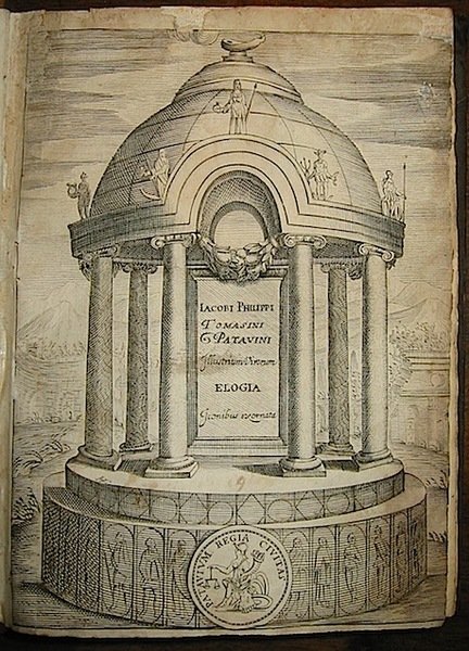 8vo (cm. 20), 8 cc.nn., 369 pp. (mal numerate 373), 25 cc.nn. con un’ antiporta raffigurante un tempietto greco tra le rovine e 47 ritratti calcografici a piena pagina attribuiti a Jerome David. Numerosi stemmi e medaglioni xilografici n.t. Legatura ‘800 in mz. pelle marrone scuro con fili, fregi e titolo oro al ds. Piatti in tela anch’essi in marrone scuro. Tagli colorati a spruzzo. Antiche scritte al frontespizio e un timbretto nobiliare sul retro del medesimo. Buoni interni anche se con alcuni aloni, qualche pagina ingiallita e una scritta al margine laterale dell’ottava carta non numerata. Edizione originale. L’opera, dedicata a Io.Battista Agucchia, Nunzio Apostolico a Venezia, è composta da 74 biografie, in massima parte corredate da ritratto e talora da stemmi di famiglia, simboli, monete ed epitaffi degli uomini illustri (Cardinali, Filosofi, Giuristi, Matematici, Medici, Commediografi, ecc.) nati a Padova o comunque legati alla città per avervi studiato, insegnato, essere stati membri dell’Accademia, o per altri motivi. Completano le biografie ben sette Indici dedicati ai nomi propri, ai luoghi, alle monete, ai simboli, agli stemmi delle famiglie, agli epitaffi ed alle iscrizioni. L’A. scrisse in seguito un altro libro sui letterati e sapienti, edito da diverso stampatore, con ritratti ad opera di altri intagliatori, pubblicato nel 1644. Questo, come il nostro, è comunque autonomo e a sé stante (dello stesso nostro avviso Vinciana, anche se consiglia per motivi di organicità di tenere insieme i due libri; di contrario avviso invece Brunet. Cicognara possedeva solo il libro edito del 1644 e non menziona neppure il nostro. Cfr. inoltre Praz, p. 515.