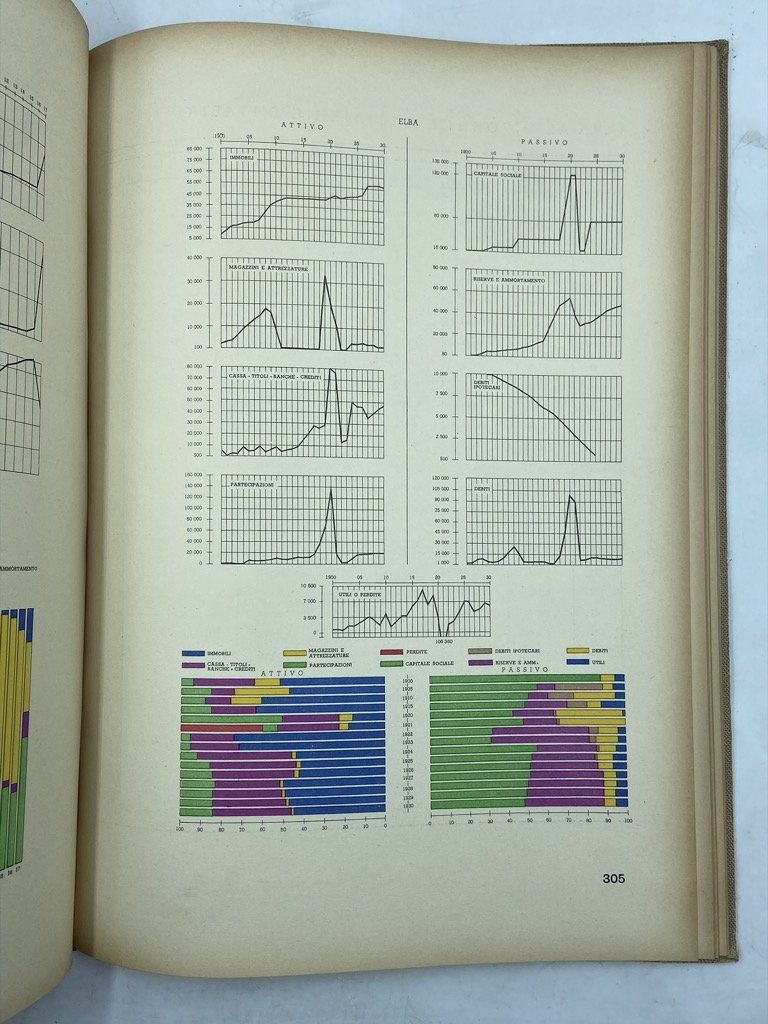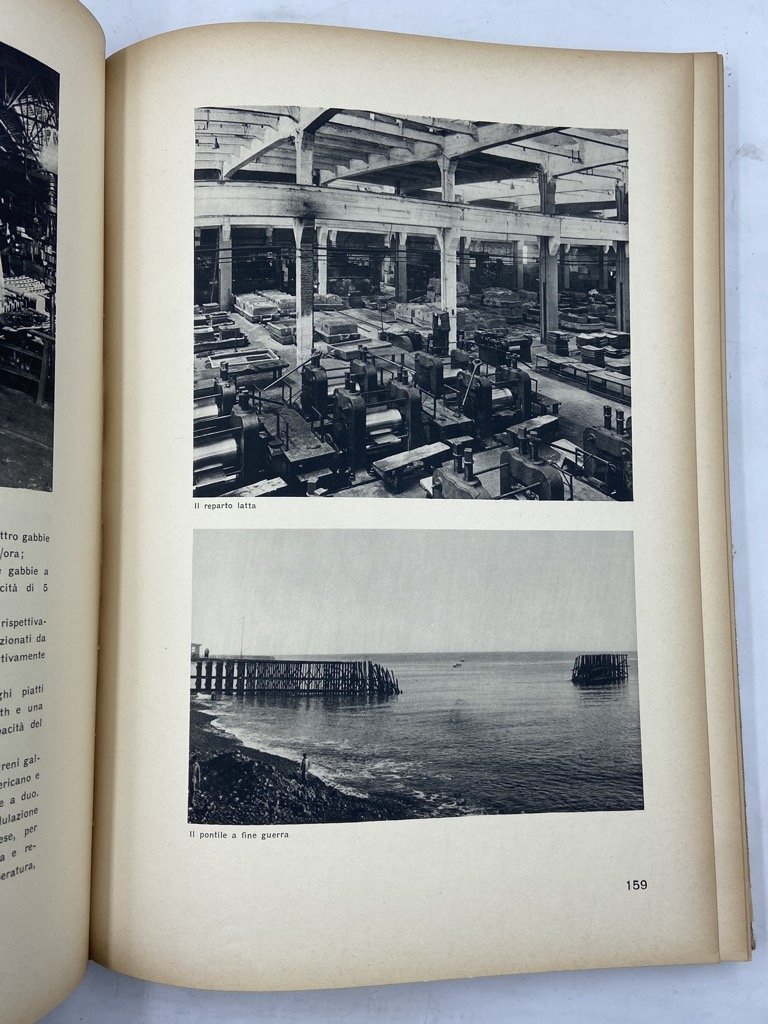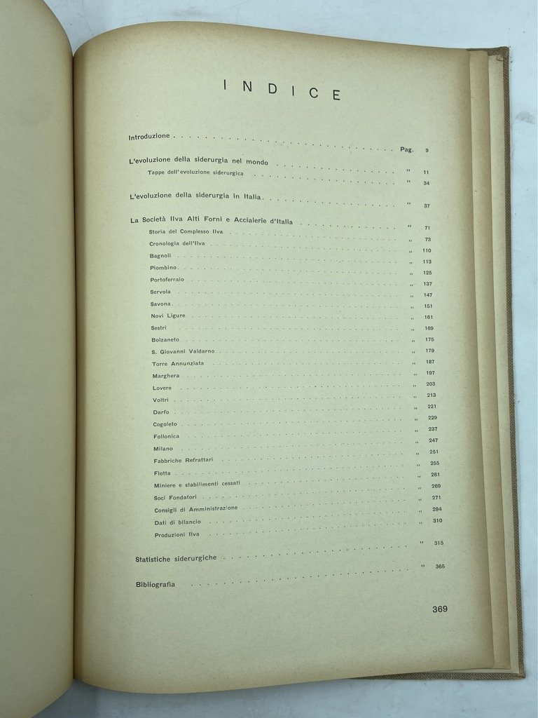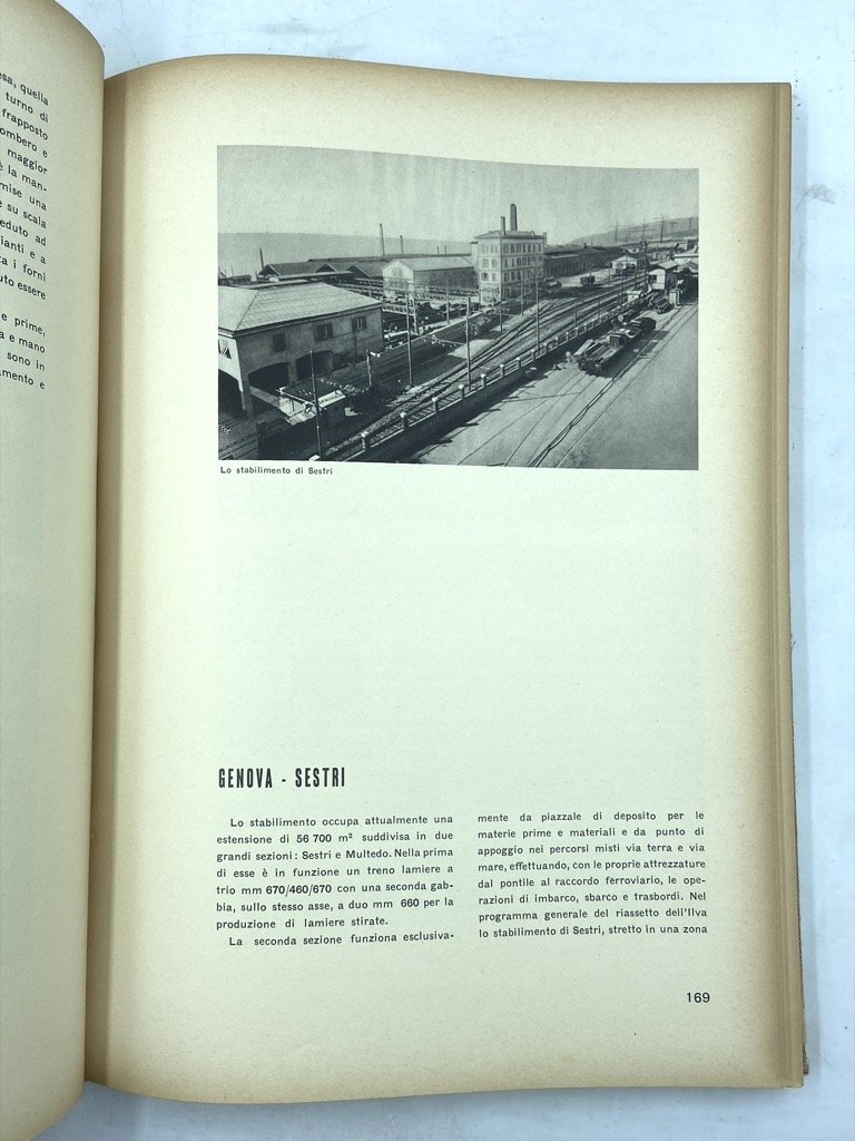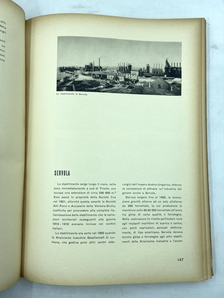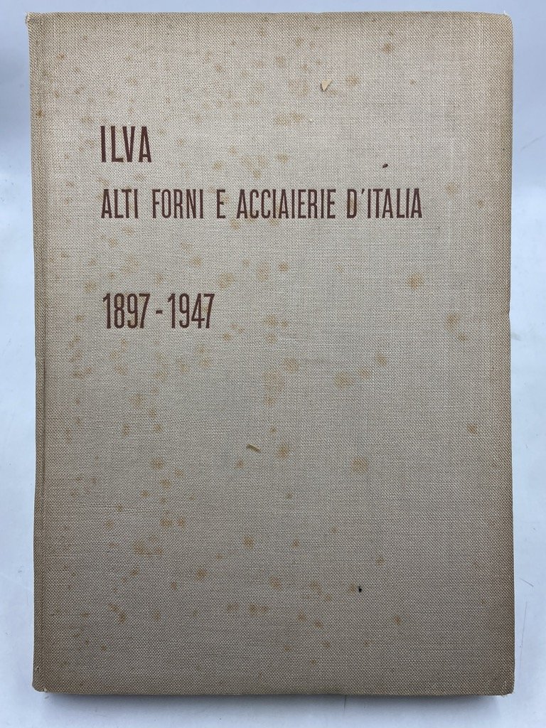Tela editoriale (lievi fioriture), cm 34.5 x 24.5, pp 369 (3) con numerose illustrazioni in nero e alcune a colori. Monografia pubblicata in occasione del primo cinquantenario dell’azienda, fondata come «Alti Forni, Fonderie e Acciaierie di Piombino» nel 1897 e giunta alla denominazione ILVA Alti Forni e Acciaierie d’Italia dopo le progressive acquisizioni di Ferriere Italiane, Ligure Metallurgica, Elba di Miniere e di Alti Forni, Siderurgica Savona e Ilva. Dopo una parte introduttiva, con la storia della siderurgia nel mondo e in Italia, il corpo centrale del volume è dedicato alla storia dell’azienda e illustra con numerose fotografie gli stabilimenti di Bagnoli, Piombino, Portoferraio, Servola, Savona, Novi Ligure, Sestri, Bolzaneto, S. Giovanni Valdarno, Torre Annunziata, Marghera, Lovere, Voltri, Darfo, Cogoleto, Follonica, e Milano, le Fabbriche Refrattari di Vado Ligure, la flotta, le sedi cedute o chiuse (miniere, stabilimenti di Pra, Oneglia, Forno d’Allione, Udine); l’ultima parte dell’opera presenta dati statistici, della produzione e andamento dei prezzi, bilanci, personale.