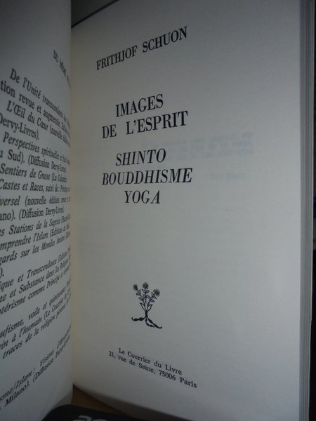 Schuon, Frithjof. Paris, Le Courrier du Livre, 1982. Images de l' esprit. Shinto, Bouddhisme, Yoga. In-8°, cartoncino edit. 144 pp. con 5 illustrazioni n.t. Testo in francese. Come nuovo. Neg. esot. mob. 100