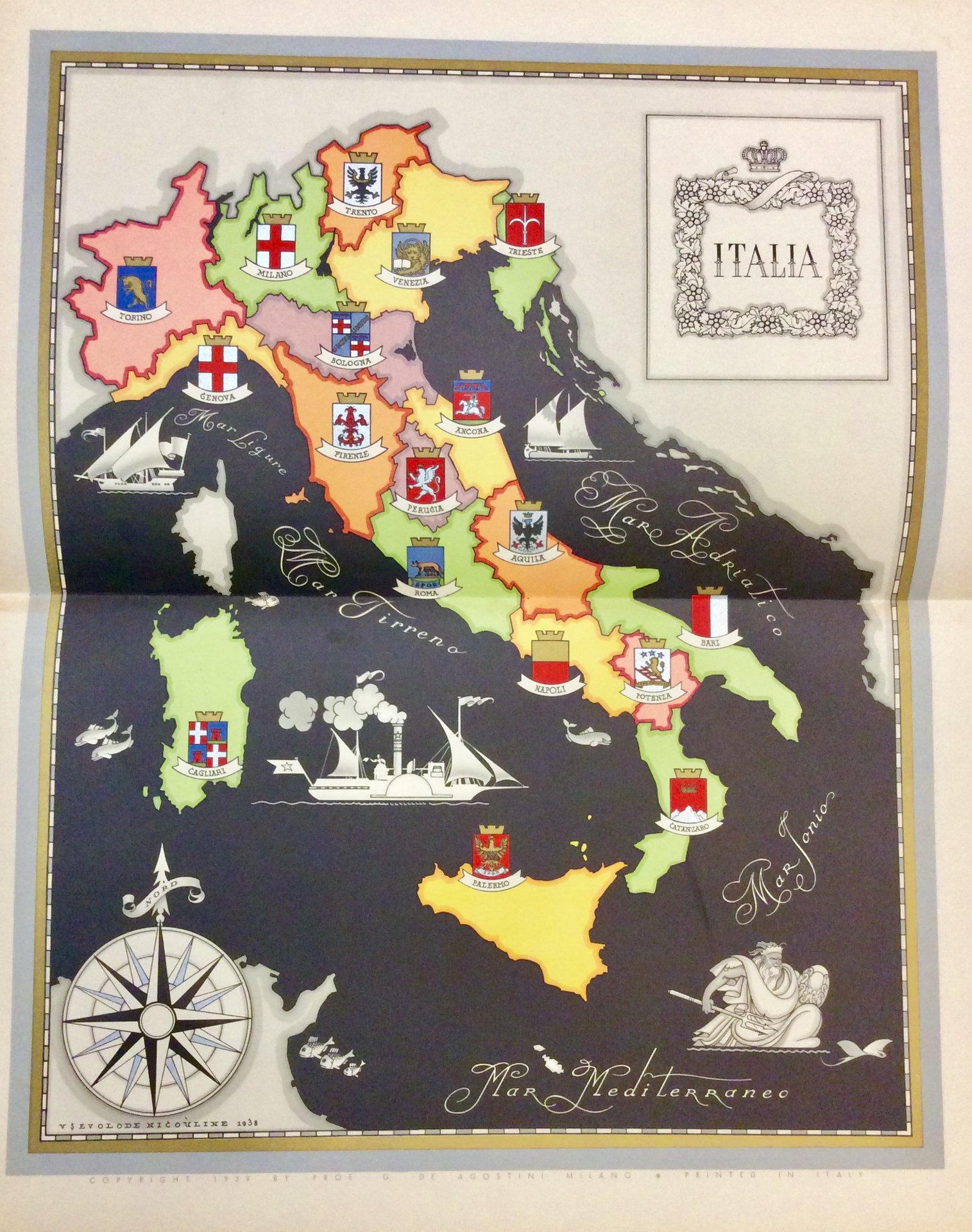 In-folio (mm. 461x300), similpelle editoriale (dorso rifatto in pelle moderna; titolo oro su tassello applicato al dorso, cerniere interne rinforzate in tela). Bellissimo grande atlante, con 19 splendide illustrazioni inedite a colori eseguite dal pittore V. Nicouline, una per ogni regione italiana, a doppia pag., con 420 pp. nn. di testo che tracciano la fisionomia delle singole regioni italiane. L'opera raccoglie notizie scientifiche, economiche, storiche, letterarie, etc. Tiratura limitata di 999 esemplari numerati. Il ns., 282, appartiene all'edizione principe, stampata in 299 esemplari.Lieviss. ingialliture ai margini per la qualità della carta, altrimenti esemplare in ottimo stato.