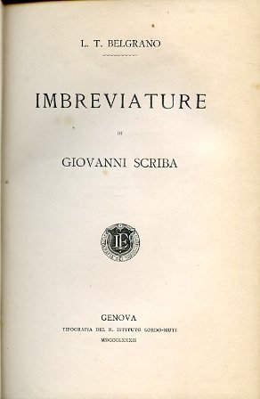 In-8°, (4), 492, legatura coeva m. pelle con titolo in oro e decori losangati a secco entro scomparti su dorso a nervi. Sguardie marmorizzate. Brossura originale conservata. Ottimo stato. Prima e unica edizione in volume degli articoli che il Belgrano (Genova, 1838-ivi, 1895), uno dei massimi studiosi del suo tempo di storia ligure e della questione colombiana, pubblicò sul giornale 'il Caffaro' sotto lo pseudonimo di Giovanni Scriba. Comprende: Matrimonio e consolato di Carlo Goldoni; Aneddoti sugli ultimi anni della Repubblica di Genova; Assedio e blocco di Genova (1799-1800); San Napoleone; Spigolature nella Corrispondenza di Nicolò Paganini; Giunte e Correzioni.