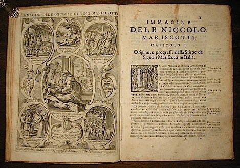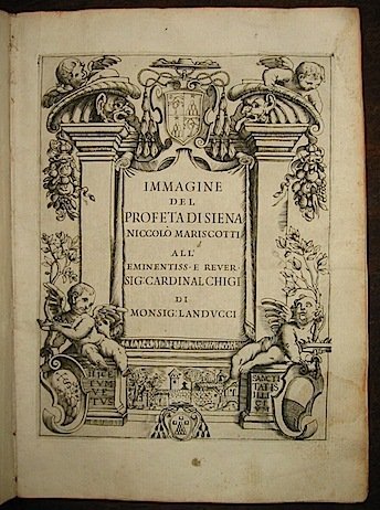 4to (cm. 22,6), 8 cc.nn. (di cui un’ antiporta incisa in rame), 157 (11) pp. e una tav. f.t. (raffigurante episodi della vita del Profeta). Capilettera ornati e figurati. Legatura coeva in piena pergamena molle (leggermente allentata) con cornici e fregi oro ai piatti. Ds. scurito con titolo ms. poco leggibile. Tagli colorati. Un alone al frontespizio e carte un po’ ingiallite, ma buon esemplare. Prima edizione. Moreni I, p. 504. Manca alla Vinciana.
