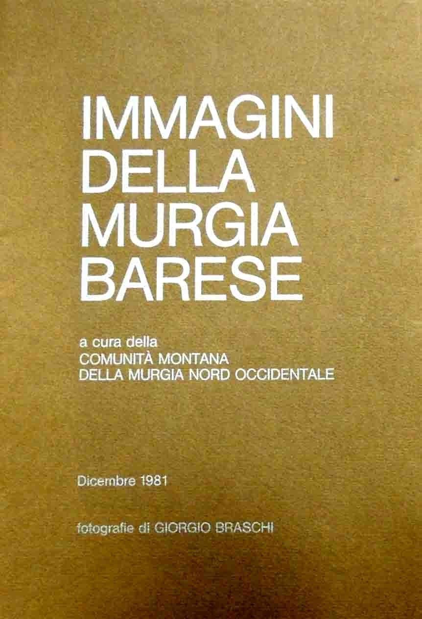 Immagini della Murgia Barese, a cura della Comunità Montana della Murgia Nord Occidentale, fotografie di Giorgio Braschi, s.n., s.l., dicembre 1981, cartellina in cartoncino ed. cm 35 contenente 6 c. di tavv. sciolte cm 34x24 delle quali una riproduce il testo Benvenute le terre del mondo, di Walt Whitman, le altre cinque riproducono fotografie della Murgia realizzate da Giorgio Braschi. Ottimo.