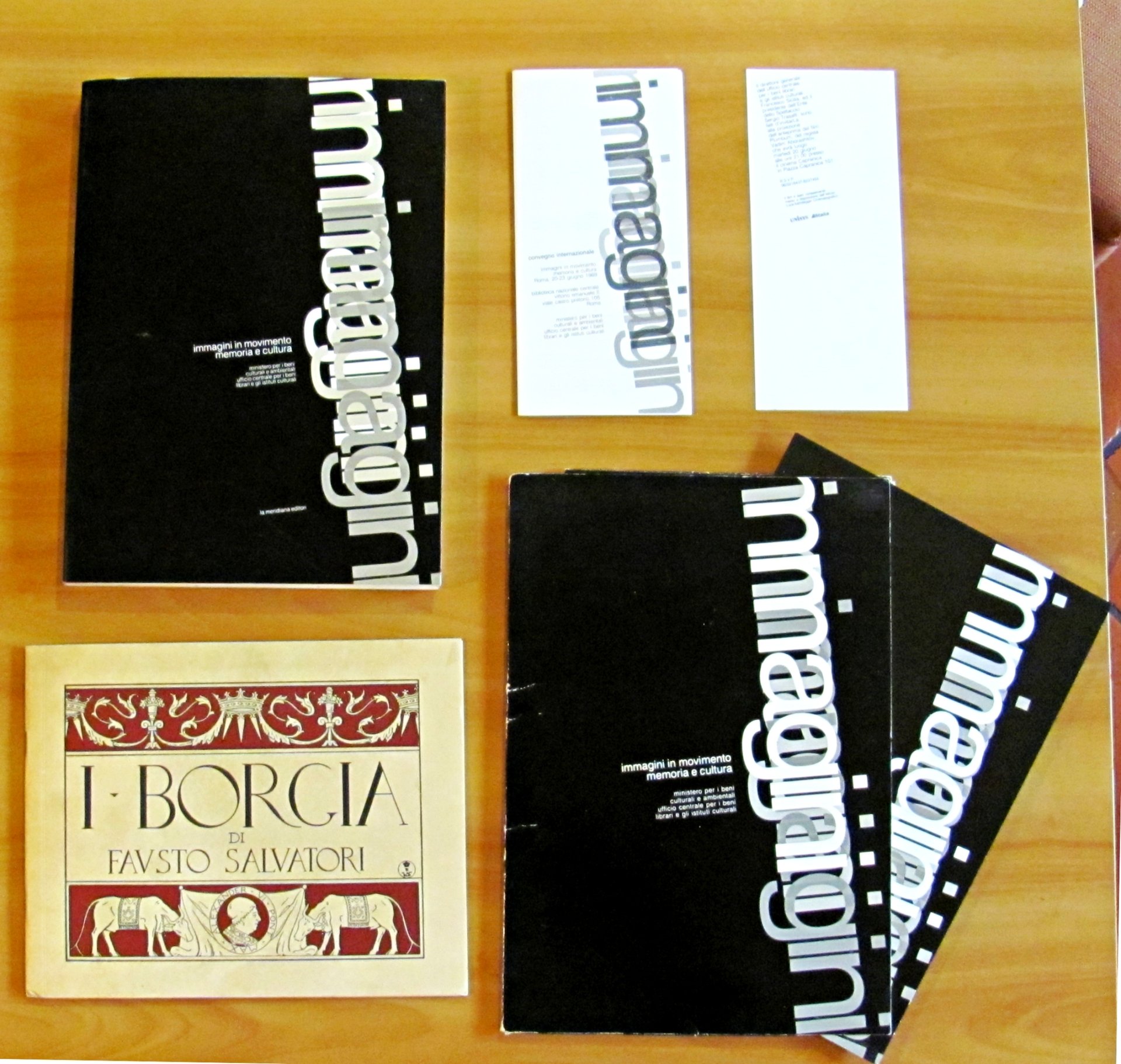 Custodia, Libro sulla Storia del Cinema Italiano dal 1905 al 1943, Programma del Convegno tenuto a Roma il 20-23 giugno 1989 e inviti + allegato "I Borgia di Fausto Salvadori" Illustrazioni in b/n e a colori, anche a piena pagina, con didascalie. Ed. La Meridiana - Milano, 1989. Custodia in cartoncino con tasca contenente il libro Immagini in brossura editoriale con ali, diversi inviti e il programma del Convegno. La sola custodia presenta lievissimi segni del tempo e la tasca risulta parzialmente scollata nella piegatura superiore. Unito al libro I Borgia in brossura. Ad esclusione della custodia tutto il resto è in Stato di Nuovo. Custodia 22,5x32; Libro Immagini 22x30 pp.144; Libro I Borgia 25x20 pag. non numerate. RARO NELLA SUA COMPLETEZZA. OTTIMO STATO , Ottimo (Fine)