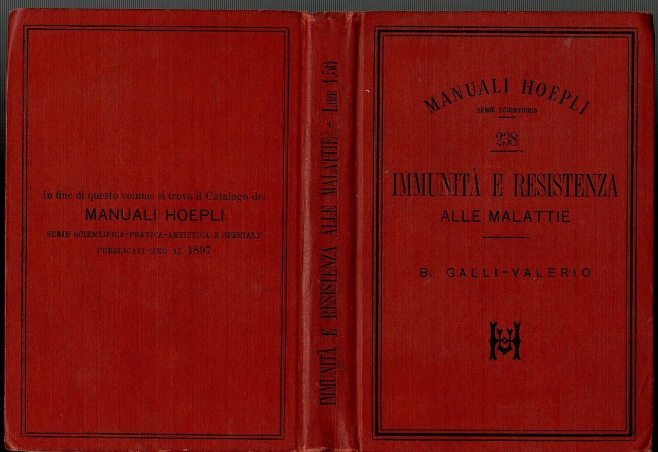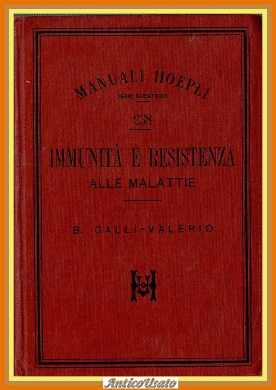 IMMUNITÀ E RESISTENZA ALLE MALATTIE di Bruno Galli Valerio. Hoepli Editore, 1897. 218 + 64 pagine. Copertina editoriale in tutta tela. Stato di conservazione: molto buono (pagine normalmente ingiallite, timbro privato di appartenenza) Libro usato saggistica medicina