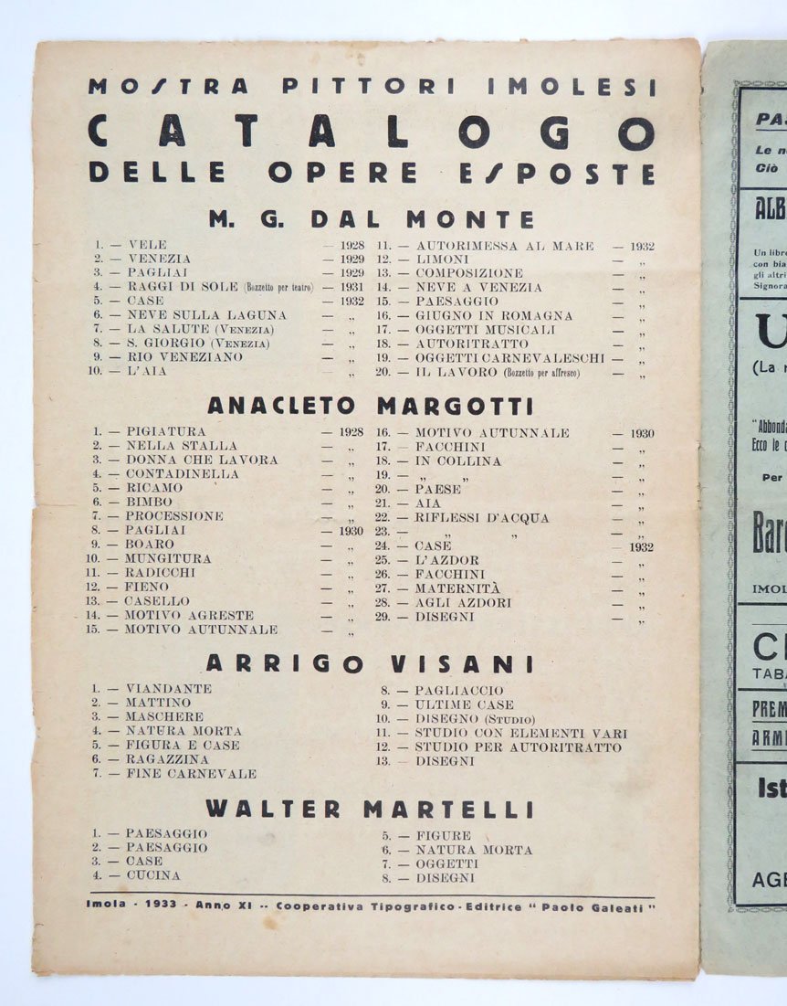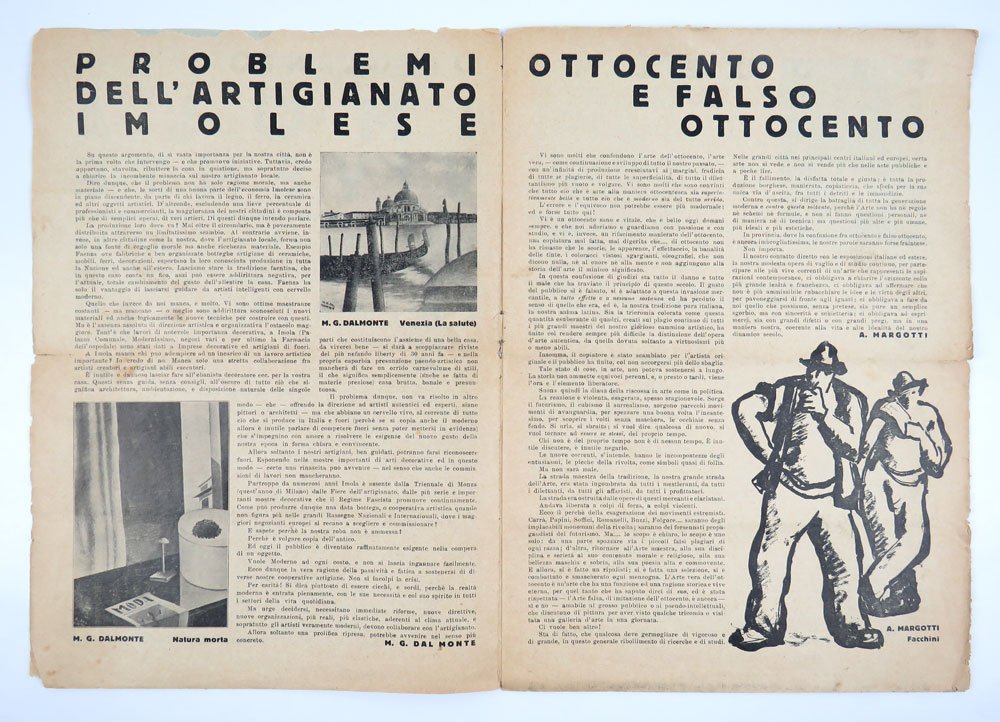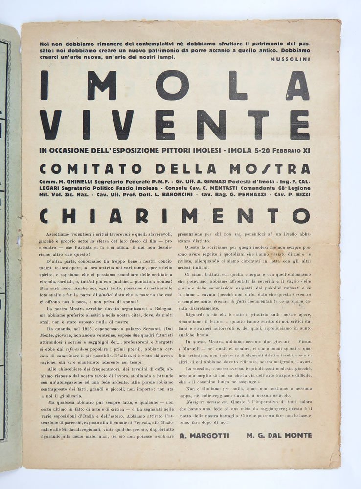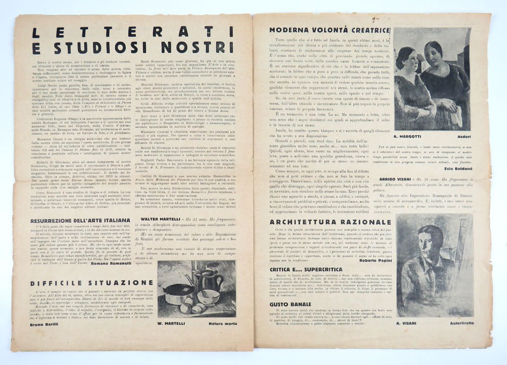 PERIODICOEdizione originale.Più che buon esemplare, quasi ottimo, con normali lievi segni del tempo perimetrali, particolarmente sul bordo esterno delle pagine, con il segno della piegatura orizzontale e un principio di separazione lungo lo stesso segno.Rarissimo numero unico organizzato dall’ex futurista Guido Dal Monte, passato a un originale versione molto moderna del Novecentismo, a pari merito con il collega passatista Anacleto Margotti; ospiti i due giovani ventenni Arrigo Visani e Walter Martelli. Notevole impaginato in puro stile futurista secondo i dettami del gruppo torinese di Fillia, Diulgheroff, Oriani, Pozzo etc. Una sola localizzazione istituzionale in Italia, secondo ICCU, alla Comunale di Imola; nessuna all’estero. -- Contiene un «Chiarimento» sulle ragioni della mostra, «Problemi dell’artigianato imolese» di Dal Monte, «Ottocento e falso Ottocento» di Margotti, articoli redazionali non firmati e brevi prose aforistiche di Romano Romanelli, Bruno Barilli, Roberto Papini. In ultima pagina il catalogo della mostra, con 20 opere di Dal Monte, 29 di Margotti, 13 di Visani e 8 di Martelli. -- Importante e notevole l’apparato iconografico, con le opere «Autoritratto», «Venezia (La salute)», «Natura morta» di Dal Monte, «Facchini», «Maternità», «Azdori» di Margotti.