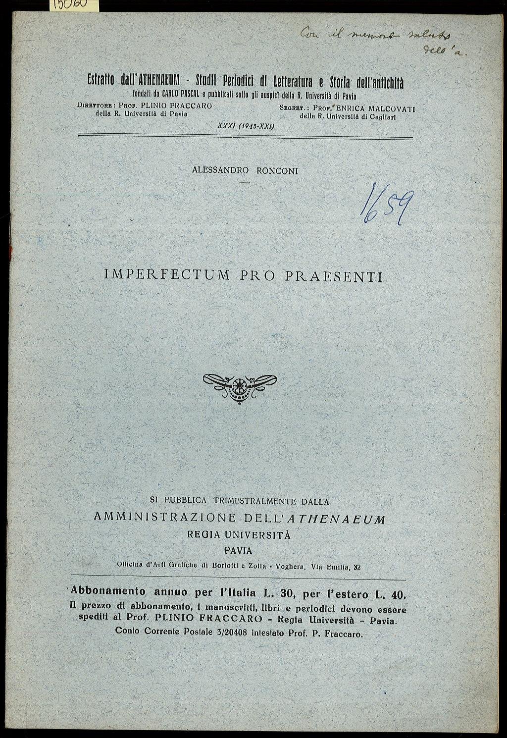 Opuscolo vintage. Estratto dall’Athenaeum – Studii Periodici di Letteratura e Storia dell’Antichità XXXI (1945 – XXI). Dedica autografa dell’autore. Usura da scaffale. Segno del tempo.