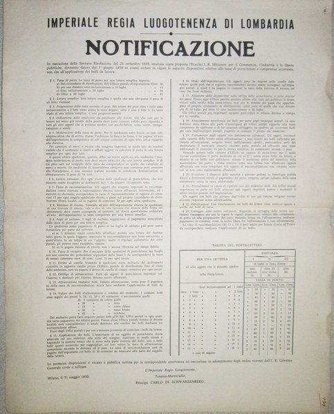 Imperiale Regia Lungotenenza di Lombardia. Notificazione. Milano , 31 Maggio 1850. Principe Carlo di Schwarzenberg. Disposizioni relative alle tasse di porto - lettere e competenze accessorie, non che all'applicazione dei bolli da lettera.