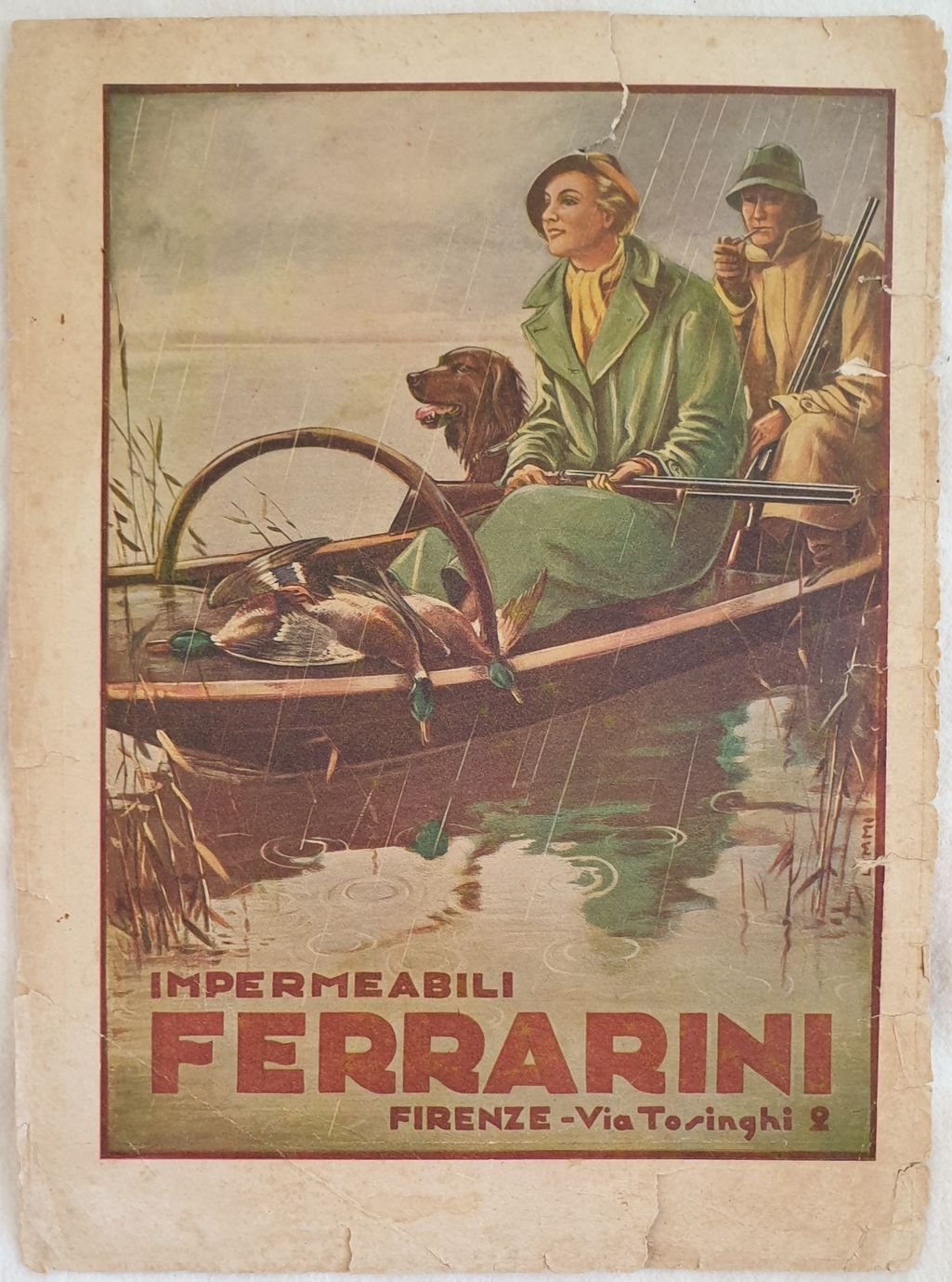 Pubblicità del 1938 degli impermeabili Ferrarini di Firenze di Lemmi. In discrete condizioni con strappi laterali. Al verso copertina Diana del 31 maggio 1938. In 4. Dim. 28,5x21,5 cm. Advertising of 1938 of waterproof suit Ferrarini from Firenze by Lemmi. In fair conditions with tears in the edges. In the verso cover of Diana of the 31st of may 1938. In 4. Dim. 28,5x21,5 cm.
