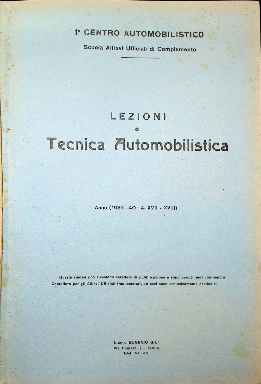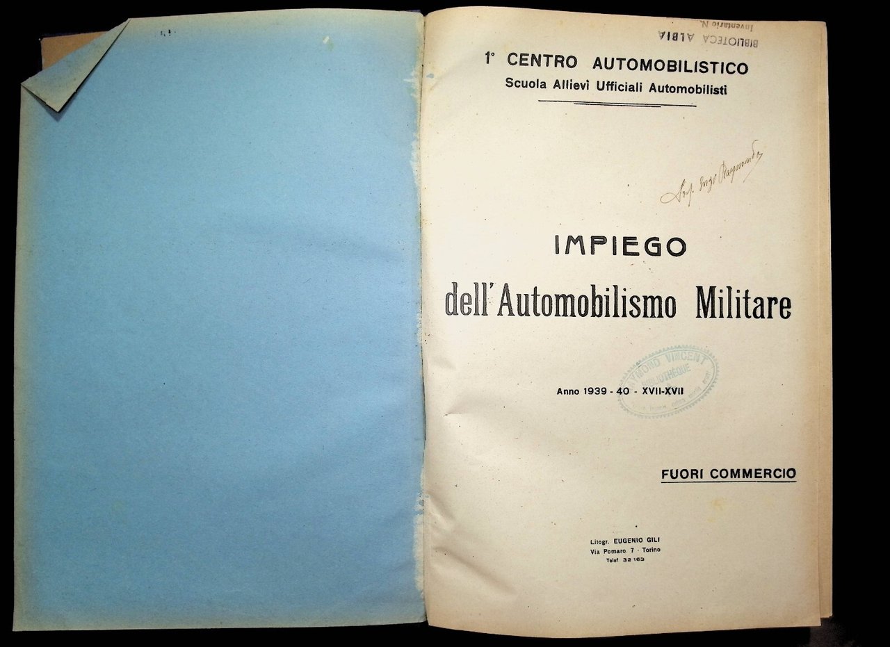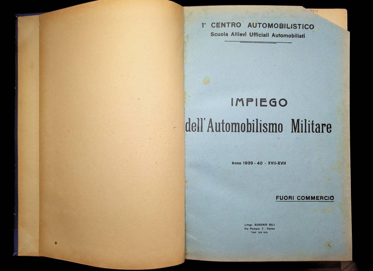 2 Libri rilegati 1939-1940: Impiego dell'automobilismo militare / Lezioni di tecnica automobilistica. Edizioni fuori commercio 1^ Centro automobilistico Scuola Allievi Ufficiali Automobilisti Legatura in tela, in 8vo grande, 31 x 22, 2 volumi dattiloscritti con alcune illustrazioni in b/n Condizioni: buone compatibilmente con l'età