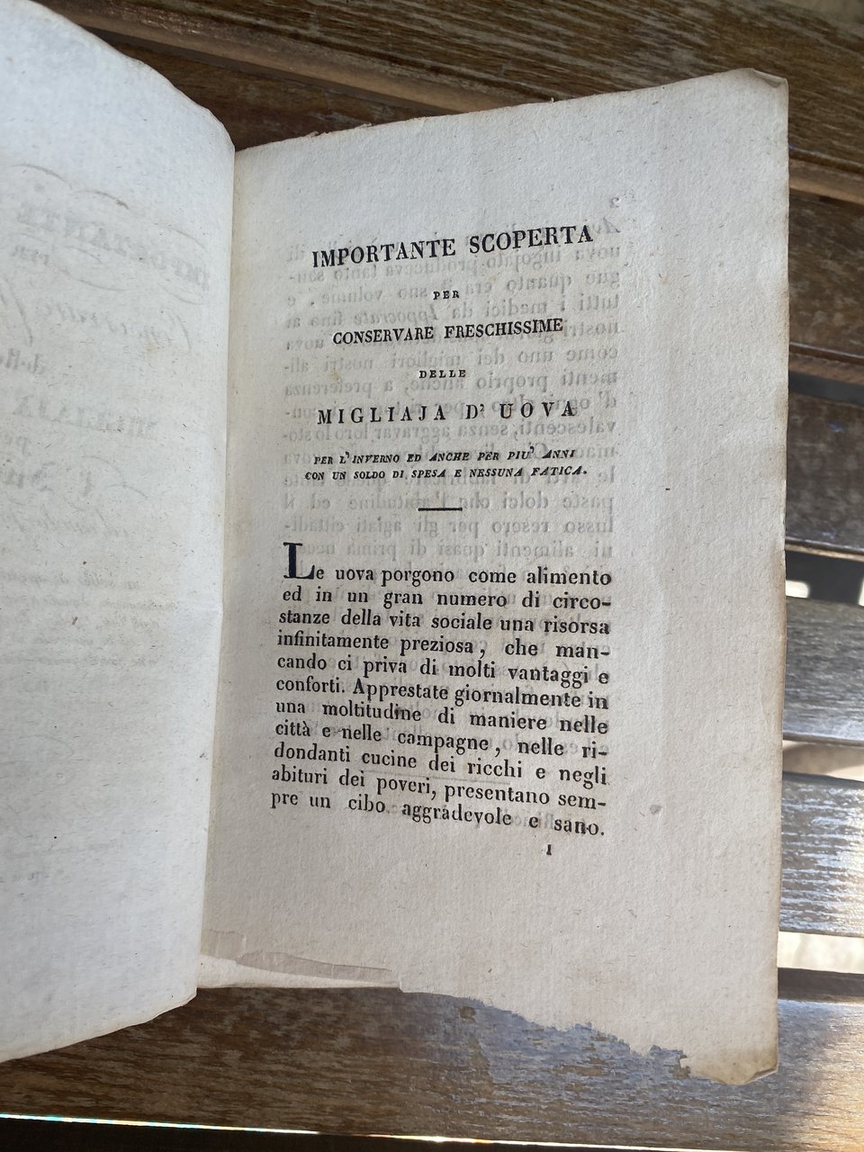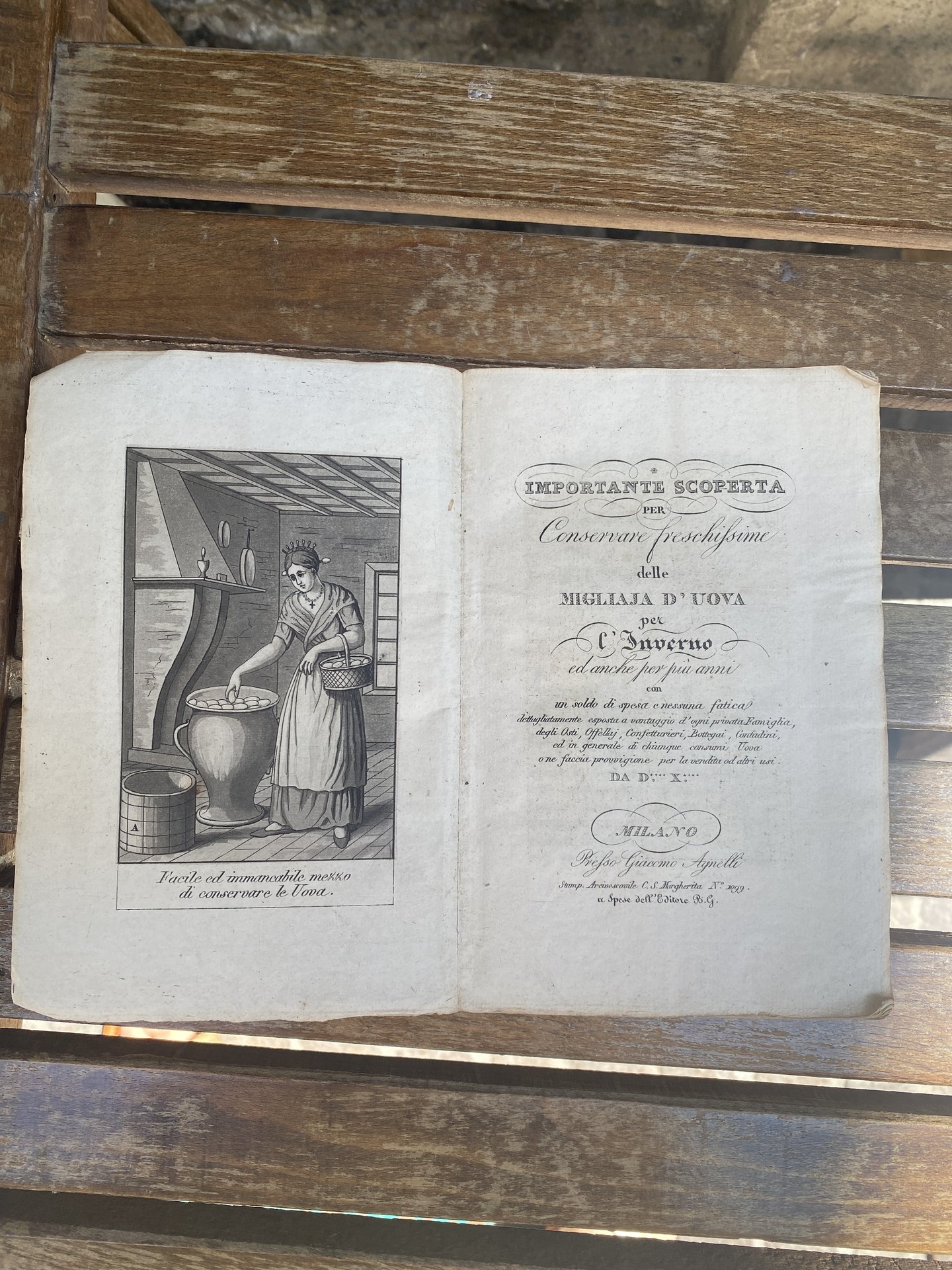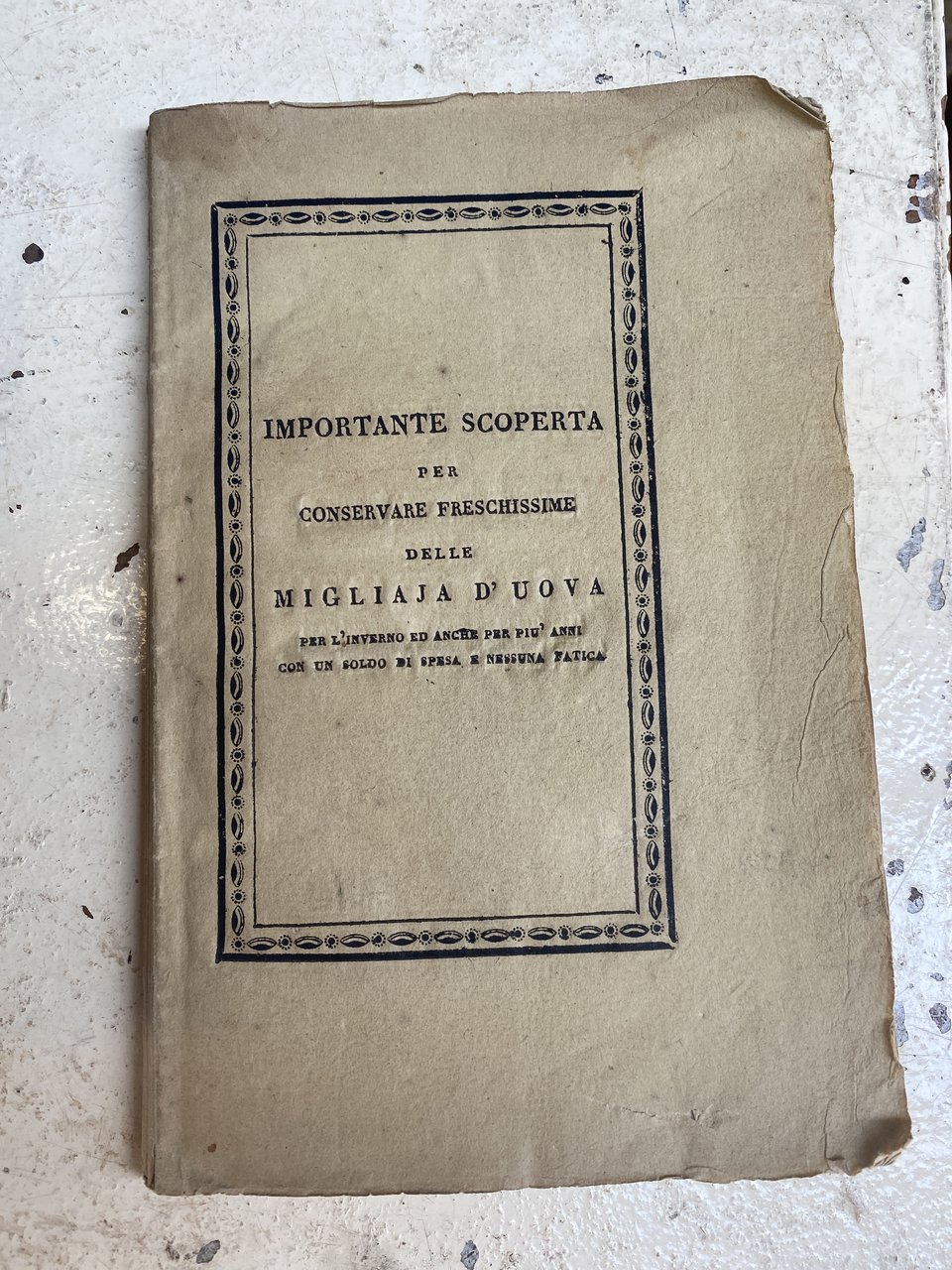 Libretto in -16, illustrante un metodo per conservare le uova freschissime, pp. 56, incisione nel controfrontespizio che raffigura una contadina che ripone le uova in un grosso vaso, leg. cartacea originale con titolo in riquadro al dorso.