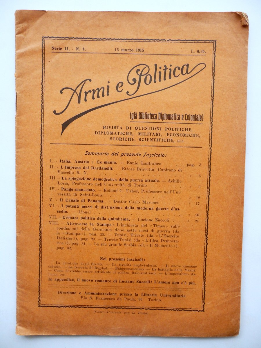 Rivista, L'impresa dei Dardanelli" e "I potenti mezzi di distruzione della moderna guerra d'assedio" in "Armi e Politica" (già Biblioteca Diplomatica e Coloniale) Rivista di questioni politiche, diplomatiche, militari, economiche, storiche, scientifiche, ecc. Serie II - Numero 1 15 Marzo 1915 Torino 1915, cm 24x17, pp. 32 con alcune ill. in b/n nel t.; brossura ed. Condizioni di conservazione Esemplare ben conservato con tracce d'uso; brossure con alcuni piccoli lievi aloni e tracce di sporco; angolo sup. delle brossure e di alcune pagine con una minima pieghetta o mancanza. Interni buoni con qualche lieve brunitura. Presenti due interessanti articoli: uno sull'impresa dei Dardanelli, di pp. 4, firmato da Ettore Bravetta; l'altro sulle moderne tecniche di assedio, di pp. 4, firmato Lionel. Entrambi sono corredati da una illustrazione in bianco e nero nel testo. Per un elenco completo degli argomenti qui trattati vedi foto del sommario presente in copertina. Numero completo. SC03.D11082 N "