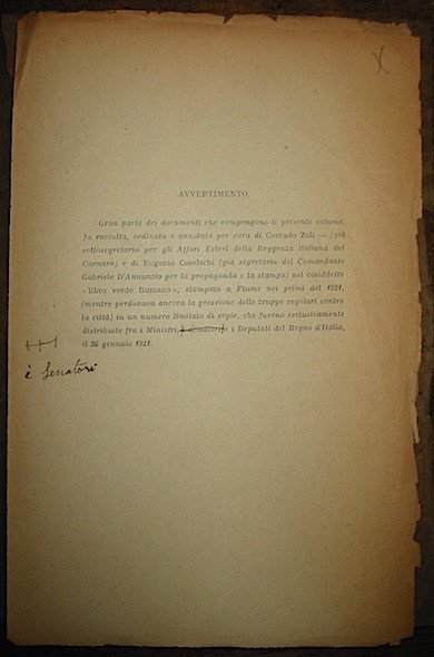 8vo (cm. 25), 261 pp., 1 c.nn. (Avvertimento). Fogli sciolti. Il testo è suddiviso in: ‘Parte Politica’ (da p. 1 a p. 79) contenente 62 Documenti; ‘Parte Militare’ (da p. 80 a p. 138) contenente Documenti dal n. 63 a l. 114; ‘Le Menzogne del Governo di Roma’ (da p. 141 a p. 156); ‘L’Azione dei cittadini nella battaglia’ (da p. 157 a p. 239); ‘Orazioni e Messaggi del Comandante’ (da p. 241 a p. 261). Carte uniformemente ingiallite ma esemplare in più che buono stato di conservazione.