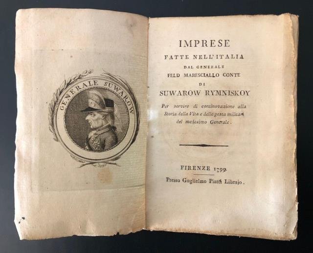 Firenze, Guglialmo Piatti Librajo, 1799. In 12esimo (cm 11 x 16), in antiporta ritratto entro tondo del Generale Suwarow, pp. 96. Privo di brossura, pagine lievemente ingiallite, più accentuate nella seconda parte, nell'insieme comunque in buono stato di conservazione. La campagna italiana di Suvorov si svolse nel Nord Italia tra l'aprile e il settembre 1799 e vide in lotta l'esercito russo – austriaco, guidato dal generale russo Aleksandr Vasil'evic Suvorov, contro le truppe rivoluzionarie francesi. La campagna s'inserisce nel contesto della guerra della seconda coalizione e si concluse con la temporanea vittoria dei coalizzati e la caduta delle repubbliche sorelle filo-francesi. €.
