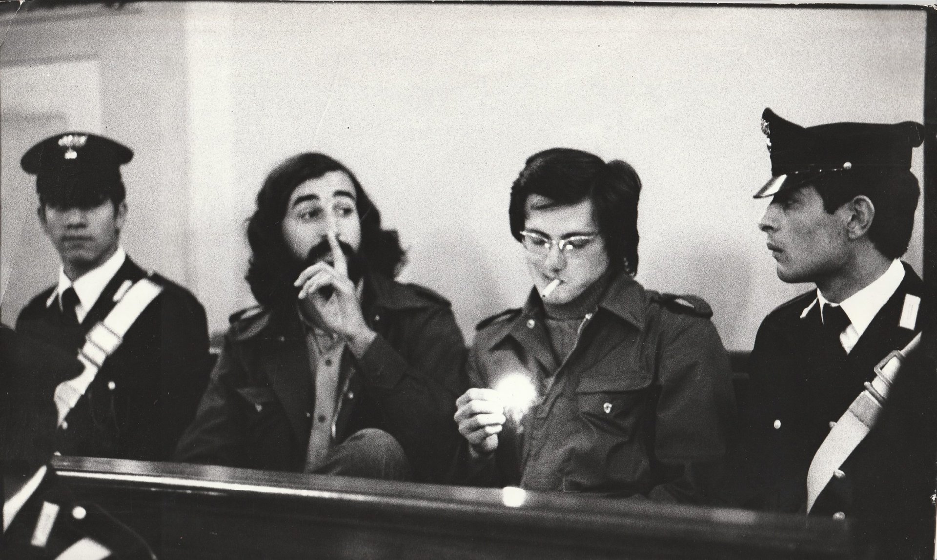 Vintage print in b/n, la foto ritrae i due imputati accusati del rapimento del giovane industriale Tony Carello, sequestrato il 3 gennaio 1973, al verso etichetta per la catalogazione, timbro del fotografo e dell'agenzia, difetti e pieghe ai margini.