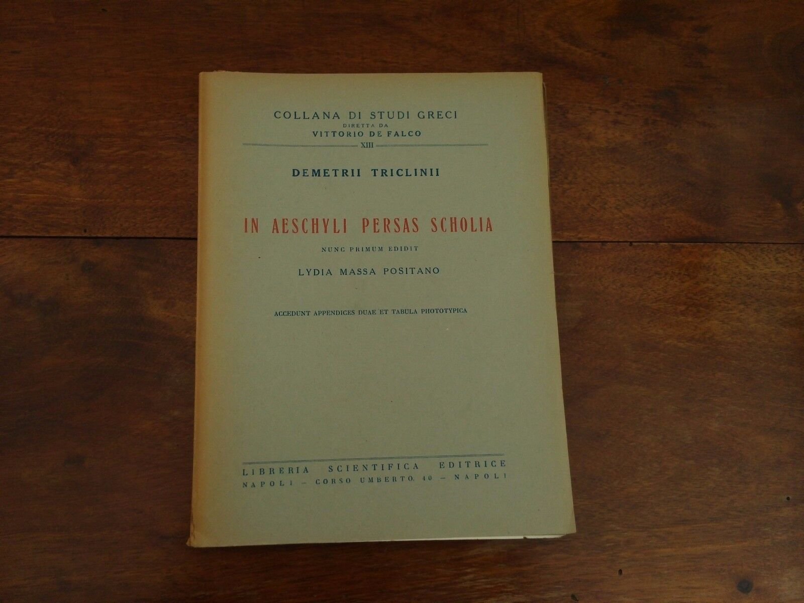A cura di Lidia Massa Positano - Demetrii Triclinii, In aeschyli persas scholia Libreria Scientifica editrice - Prima edizione 1948 Libro in ottime condizioni, minimi segni del tempo, minimi segni del tempo. Non esitate a contattarci per altre foto o richieste. Saremo lieti di soddisfare ogni vostra esigenza.