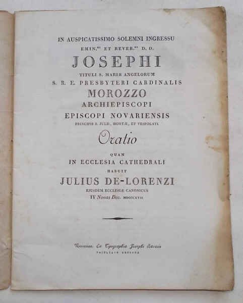 In auspicatissimo solemni ingressu emin.mi et rever.mi D.D. Josephi tituli S.Mariae Angelorum S.R.E. presbyteri cardinalis Morozzo Archiepiscopi Episcopi novariensis principis S.Julii, Hortae et Vespolati Oratio quam in eccelsia cathedrali habuit Julius De Lorenzi.