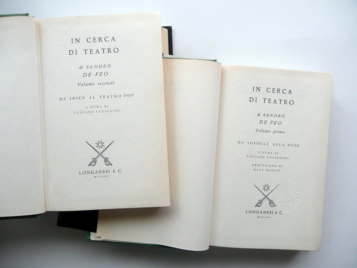 Sandro de Feo, In cerca di Teatro Volume primo: da Sofocle alla Duse A cura di Luciano Lucignani Prefazione di Raul Radice - Volume secondo: da Ibsen al Teatro - Pop a cura di Luciano Lucignani Longanesi & C. (collana I Marmi"), Milano 1972, cm 18,5x13, pp. I-XXVI; pp. 1-570 (volume primo); pp. 934 (volume II); legatura in tutta tela ed. con titolo in oro entro tassello al dorso; sovraccoperta ed. ill. a colori. Opera completa in due volumi. Condizioni di conservazione Volumi entrambi in ottime condizioni con minime tracce d'uso alla sovraccoperta ed. Interni ottimi. Opera completa in due volumi, che dedica ampio spazio alle principali forme, correnti e autori del teatro contemporaneo. SETT95.L8833 N "