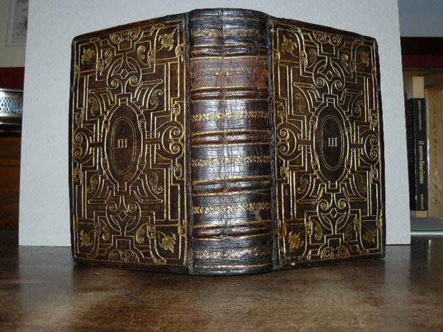 Due opere in un volume in 8° (168 x 105 mm.), pp. (4), 233 ma 273, (51); (2), XXXVI, 534, 58, marca tipografica ai frontespizi raffigurante una palma all'interno di uno scudo con il motto 'Palma ising'. Sontuosa legatura rinascimentale in piena pelle color avana scuro. Ai piatti si trova un complesso decoro costituito da intrecci di nastri a motivi architettonici e orientaleggianti con arabeschi a doppie volute simmetrici e contrapposti. Agli angoli e ai lati delle volute decori a foglie azzurrati, al centro ovale con impressa la cifra III, dorso a cinque nervi, fregi in oro e titolo manoscritto su tassello in carta. Tagli in oro con cornice cesellata ai margini dei tre tagli. Restauri alle cuffie. Celebre edizione del commento di Arethas Caesariensis all'Apocalisse. 'Diacono già nell'895, divenne metropolita di Cesarea di Cappadocia nel 901, rivestendo anche la dignità di prototrono, ossia primo dopo il patriarca. Morì poco dopo il 932. D'indole battagliera prese viva parte ai dibattiti religiosi del tempo'. Questo celebre commento si sviluppa seguendo ed analizzando quello di Andrea di Cesarea. La seconda opera contiene la celebre edizione dei commenti all'antico e nuovo testamento di Oecumenius noto per essere l'autore di diversi commentari sui libri del Nuovo Testamento e dell'apocalisse. Poco si sa dell'autore che si crede esser stato un vescovo di Trikka o (Trikla) in Tessaglia intorno al 990 d. C. Tuttavia, più recentemente, alcuni studiosi hanno ridatato questo Commento all'Apocalisse agli inizi del VII secolo, o la fine del VI secolo, e hanno individuato Oecumenius come vissuto in Asia Minore. A sua volta il commento porta le spiegazioni del noto umanista Felicianus Johannes Bernardus noto per le sue numerose traduzione di testi greci e latini. L'opera è inserita fra quelle citate nella collezione online dell'Astronomie - rara del Deutsches Museum di Munchen per le sue numerose citazioni astronomiche. Adams O 115; Reliures royales de la Renaissance; Malaguzzi,Tre secoli di legature.
