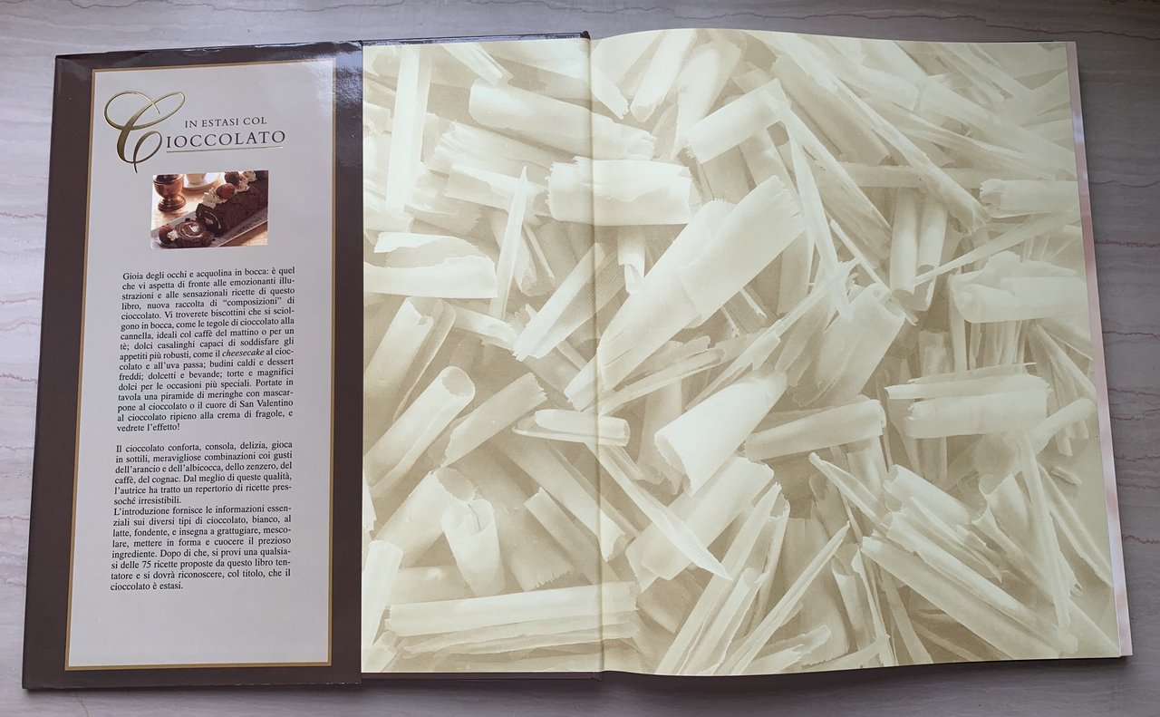 I ed. italiana (© Chocolate Ecstasy, Anness Publishing Limited 1996). Traduzione dall'inglese: Gianna Brocato. Direzione: Marco Drago, Andrea Boroli. Direttore Editoriale: Cristina Cappa Legora. Coordinamento editoriale: Valeria Camaschella. Redazione: Fenice 2000 s.r.l., Milano. IV/160/cart./sovraccoperta patinata. Illustrazioni fotografiche a colori f.t. e nel testo. Fogli di guardia illustrati nei toni del cioccolato bianco, da fotografia. Fotografie: Steve Baxter. Stato buono.