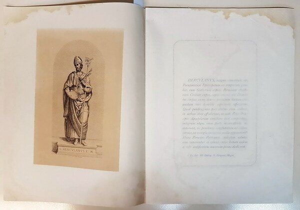 Vol. in -4 (26 x 34 cm.), brossura editoriale rosa chiato con titoli in nero sul piatto ant., testo in latino, pp. 25, (3), 2 tav. litografiche protette da velina con i ritratti di S. Ercolano e S. Costantino. Copertina con segni del tempo, nel complesso in abb. buone condizioni (integro e ben legato).