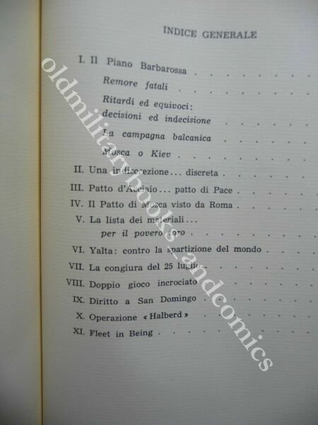 "DESCRIZIONE: Marotta Napoli 1975 I^ Ed. br. ed. similpelle con sovracc. ill. con alette pp. 301 in 8° con 37 ill. b.n. raffiguranti Ciano, Ribbentropp, il Duce, Hitler e Goring, Stalin, Churchill, facsimili di documenti fascisti, Pio XII, fosse Ardeatine. Dall'indice: Il piano Barbarossa, ritardi ed equivoci; La campagna balcanica; il patto di Mosca visto da Roma; Patto d"acciaio . patto di pace; Yalta, contro la spartizione del mondo; La congiura del 25 luglio; Operazione Halberd. CONDIZIONI: Buone sovracc. con tracce d'uso. PESO / WEIGHT: 700 gr. without package"