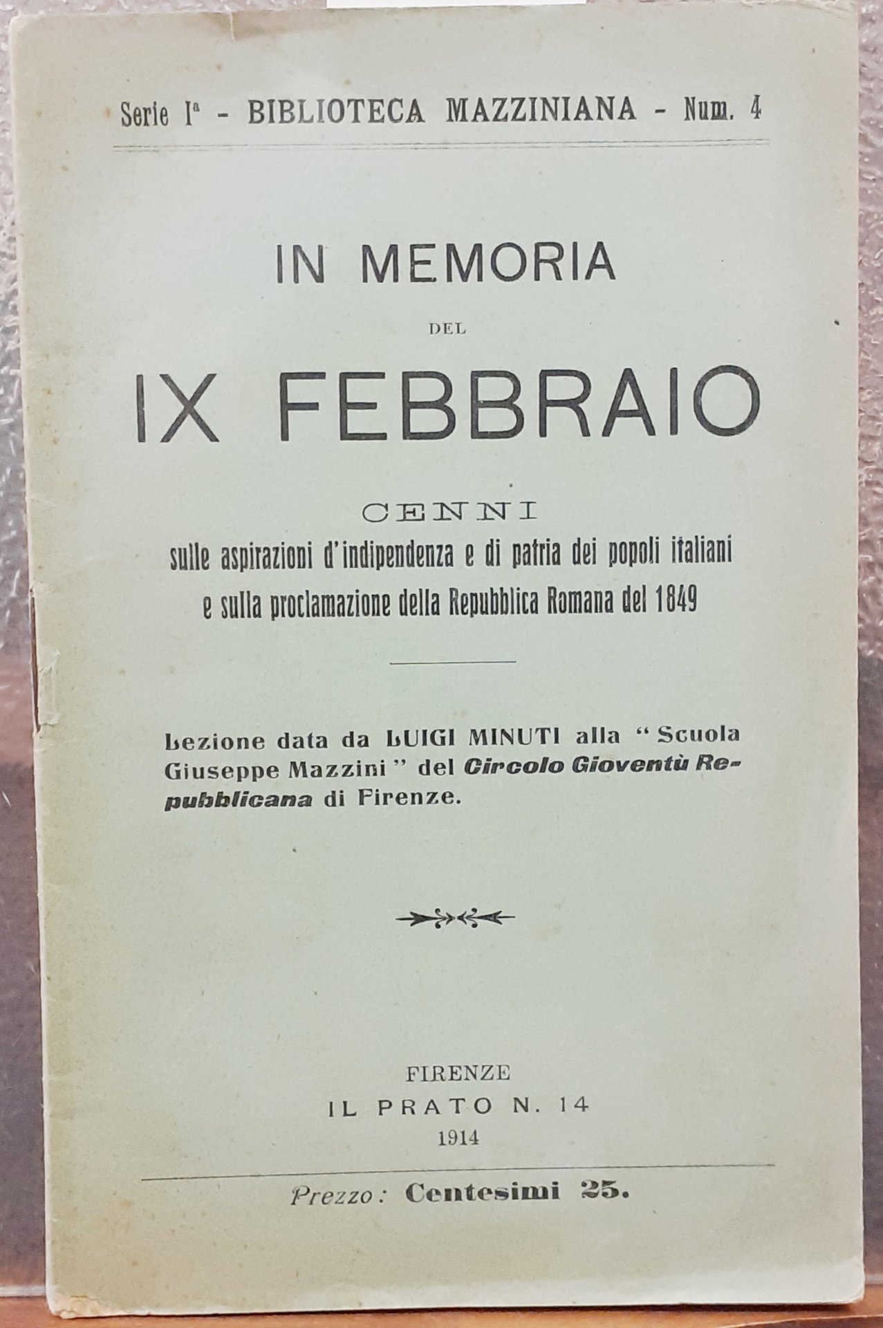 IN MEMORIA DEL IX FEBBRAIO; CENNI SULLE ASPIRAZIONI DI INDIPENDENZA E DI PATRIA DEI POPOLI ITALIANI E SULLA PROCLAMAZIONE DELLA REPUBBLICA ROMANA DEL 1849; LEZIONE DATA DA LUIGI MINUTI ALLA "SCUOLA GIUSEPPE MAZZINI" DEL CIRCOLO GIOVENTU' REPUBBLICANA DI FIRENZE. Serie 1° - BIBLIOTECA MAZZINIANA - Num. 4.,