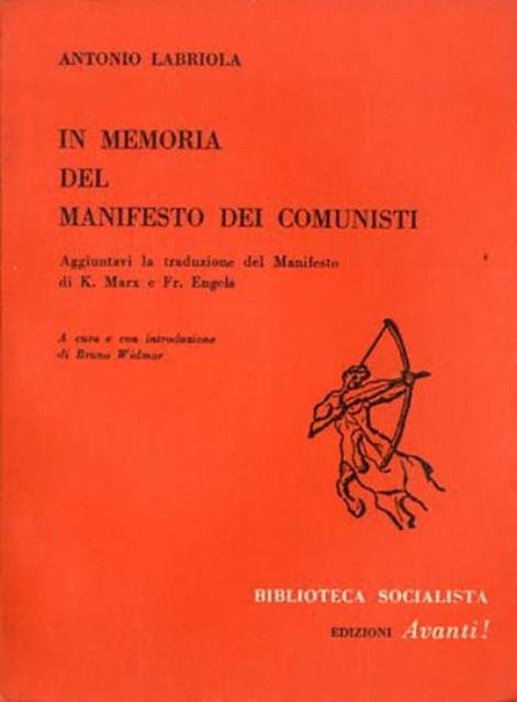 167 p. ; 16 x 12 cm. Biblioteca socialista, 19. Il saggio «In Memoria del Manifesto dei Comunisti» è qui riprodotto nella versione della terza edizione italiana (1902), l’ultima approvata dall’autore. La nota al testo ricostruisce la genesi e la storia dell’opera e delle sue traduzioni all’estero; l’apparato delle varianti rende conto delle differenze di questa edizione rispetto al manoscritto e alle versioni a stampa precedenti. In appendice è pubblicata la traduzione italiana del Manifesto marx-engelsiano che accompagnò la terza edizione del saggio. Antonio Labriola può essere considerato il principale protagonista della diffusione del marxismo in Italia, in particolare per la filosofia, e i Saggi sul materialismo storico sono tra i suoi scritti quelli che hanno goduto di maggior successo e di vasta circolazione anche all’estero. A cura e con introduzione di Bruno Widmar. Brossura editoriale, coperta illustrata in cartoncino flessibile colorato (rosso). Codice libreria 9002.