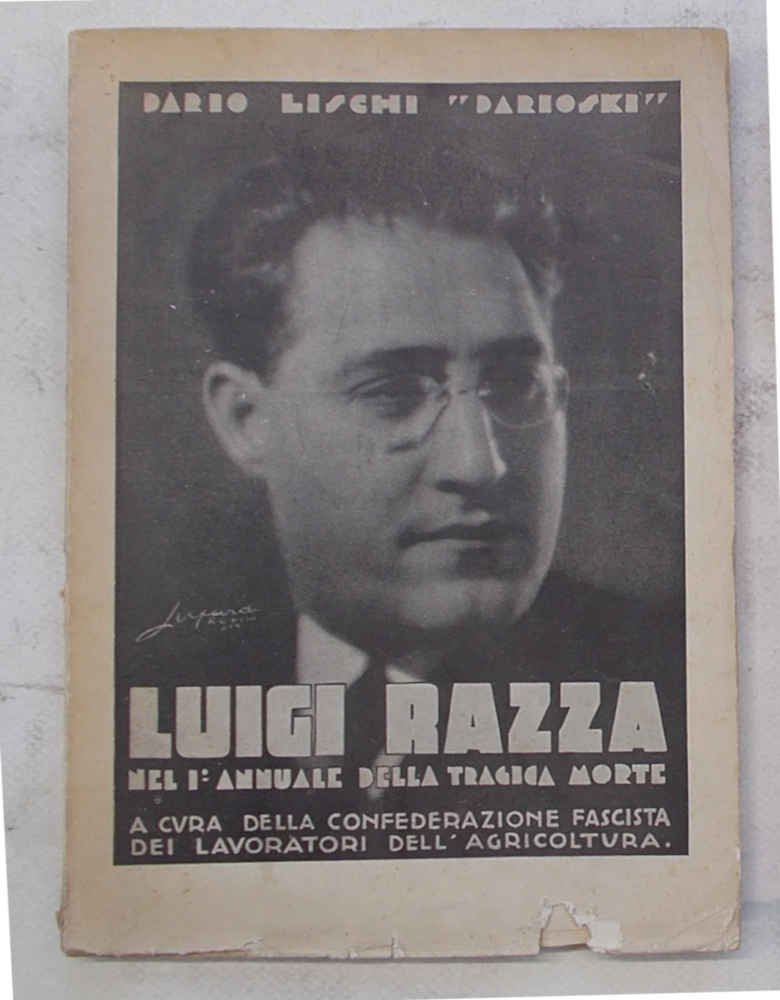 In 8° (cm. 22 x 15,5); pagg. 143; con alcune tavole fotograf. f.t. e riproduzioni di maniscritti n.t.; leggera cartonatura origin. figurata, con minime imperfezioni, ma molto buona. VG-. ** "Nel 1° annuale della tragica morte, a cura della Confederazione Fascista dei Lavoratori dell'Agricoltura". Razza, tra i principali esponenti sindacali del regime, morì in un incidente aereo poco dopo il decollo dal Cairo, diretto ad Asmara. Ci furono forti sospetti di un attentato dei servizi segreti esteri -in particolare inglesi- ma le inchieste, sia egiziana che italiana, non raggiunsero nessuna conclusione definitiva.
