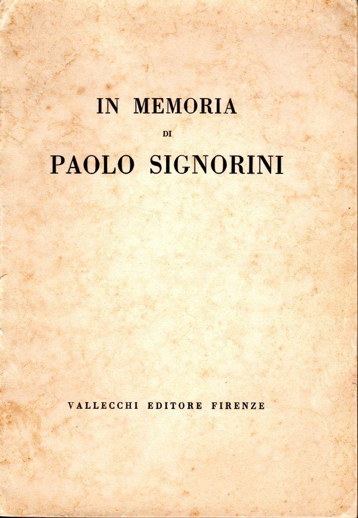 In memoria di Paolo Signorini, prima edizione novembre 1932, pp. 16, formato 17 x 24,5.<BR>Copertina morbida di colore beige con titoli in nero al piatto anteriore.All'interno presente tavola fotografica in b/n rappresentante un mezzobusto di Paolo Signorini.<BR>Fioriture ai piatti. Nel complesso buone condizioni.