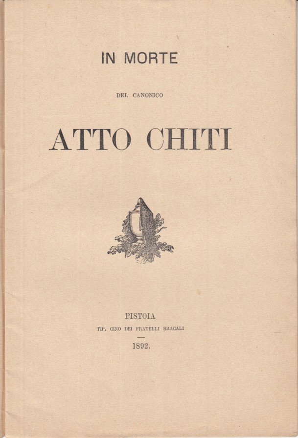 In-8 (Cm 23 x 15,2), pp. 16, brossura editoriale. Ex libris Pieri Gerini. Piccola macchiolina alla brossura posteriore e pagina precedente, brossura che risulta un po' brunita. MOLTO BUONO - Parole dette sl feretro nella Chiesa Cattedrale di Pistoia la sera del di' 8 gennaio 1892. Atto Chiti nacque a Pistoia nel 1827. Nella pubblicazione e' ricordato soprattutto per la sua generosita' verso la R. Arciconfraternita della Misericordia, la societa' operaia, la societa' degli Ospizi Marini e l'asilo infantile, le Povere figlie di S. Anna. Nel volumetto due scritti di P. Pietro Gordigiani e Luigi Bargiacchi