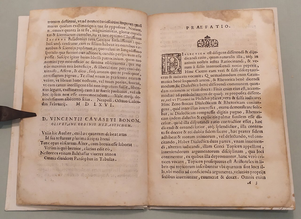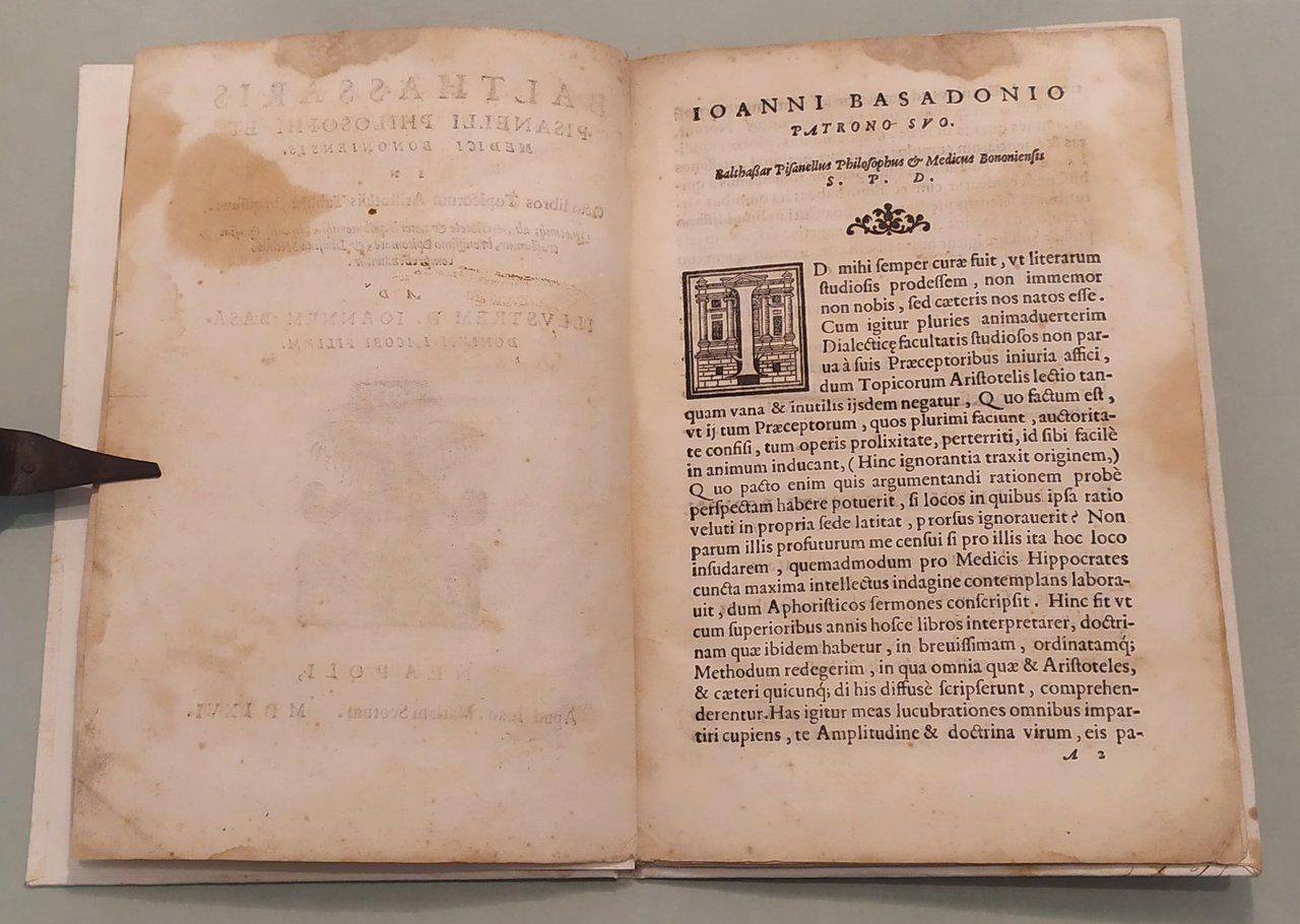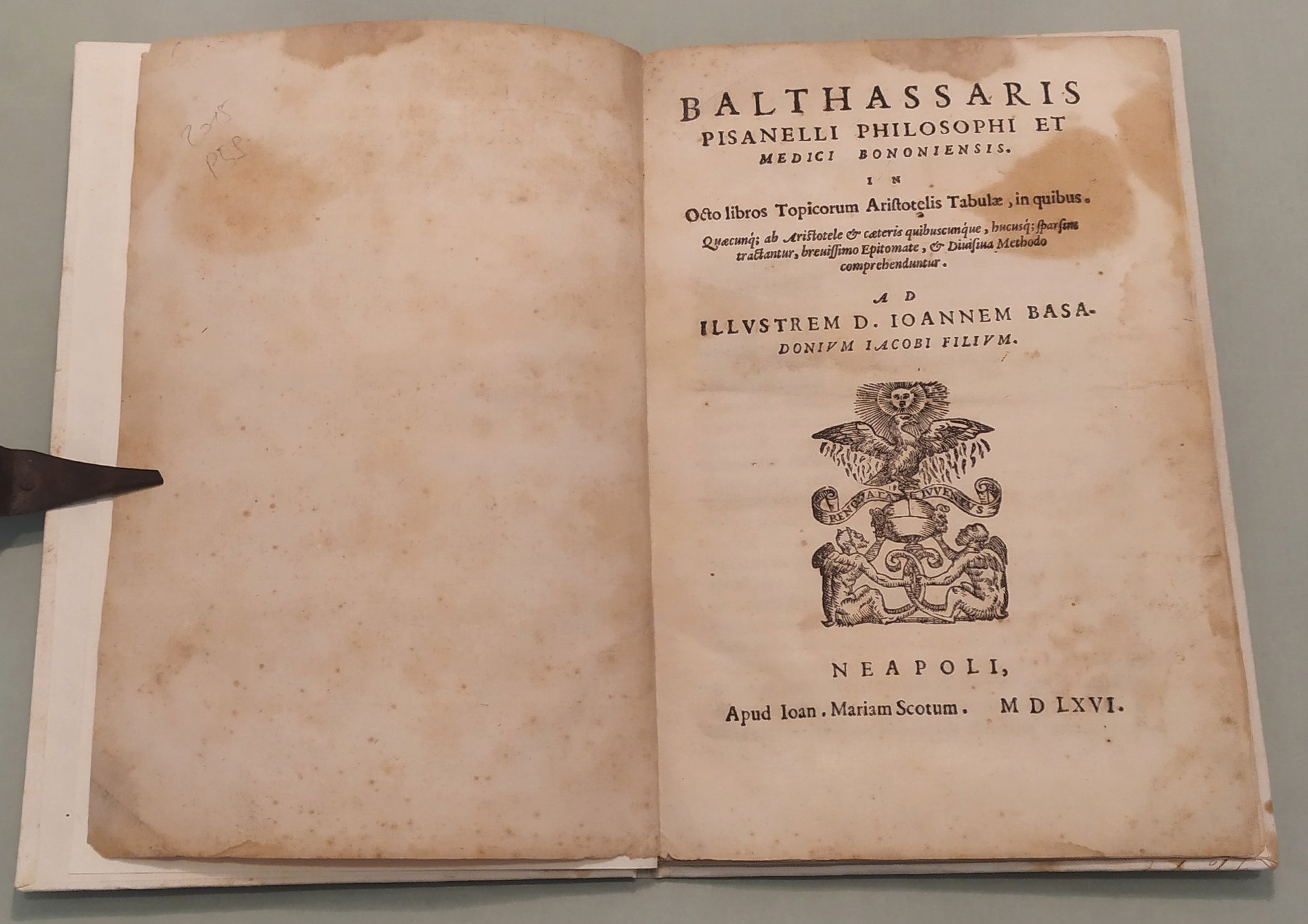 Balthassaris Pisanelli philosophi et medici Bononiensis. Neapoli, apud Ioan. Mariam Scotum, 1566. In 8vo; cc.3 n.nn., 9 numerate. Insegna tipografica al frontespizio, due capilettera silografati. Imprimatur: Iulius Pavesius Archiepiscopus Surrentinus et Ecclesiae Neapolitanae Administrator. Cart. posteriore. Edit16, 49958: "Allievo di Ulisse Aldrovandi, laureatosi in filosofia e in medicina nel 1559, ottenne una cattedra di medicina nel 1562. Iniziò a viaggiare in Germania e in Africa, stabilendosi infine a Roma dove divenne medico nell'ospedale di S.Spirito. Nato a Bologna e morto, forse a Venezia, nel 1587 circa." I principi della logica aristotelica raccolti in tavole sinottiche. Molto raro.