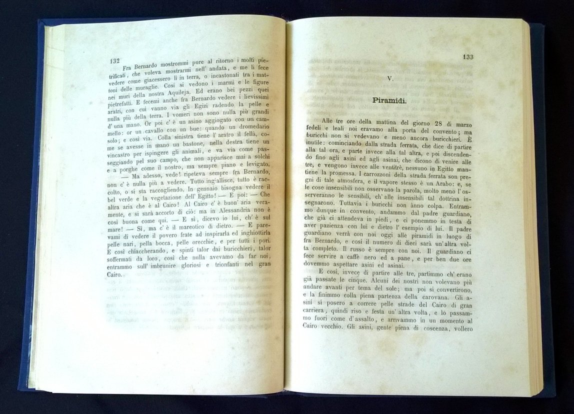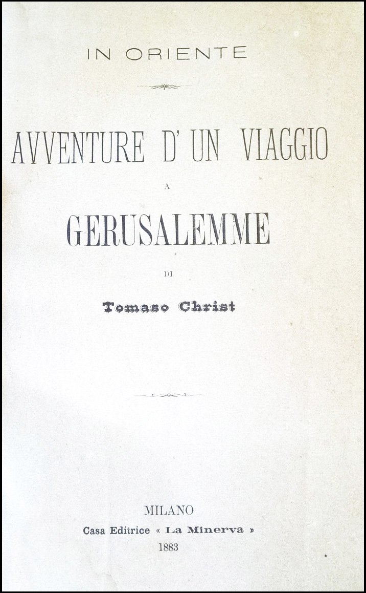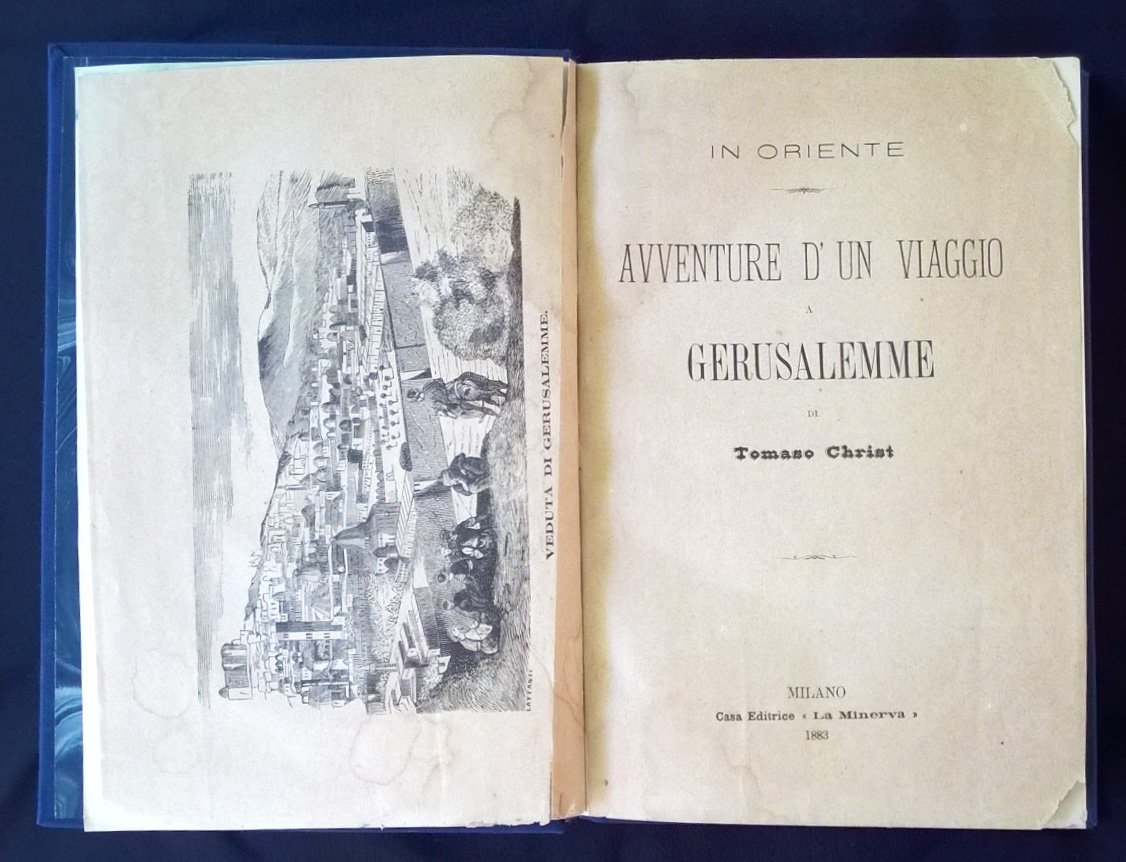 8vo, 19 cm, modern full cloth binding, gilt title at spine and with the original editorial illustrated paper covers; pp. 352, [1] plate. Text in Italian language, with a full page illustration of Jerusalem at frontispiece. RARE FIRST EDITION OF THIS REPORT ON THE ADVENTURES OF A TRAVEL TO JERUSALEM BY TOMASO CHRIST. Ref.: IT\ICCU\SBL\0730025 (2 copies). OCLC, 455845414 (one copy in USA, at the University of Pennsylvania Libraries, Philadelphia). Cond.: Presence of signs of use, foxing. Overall, a good copy.