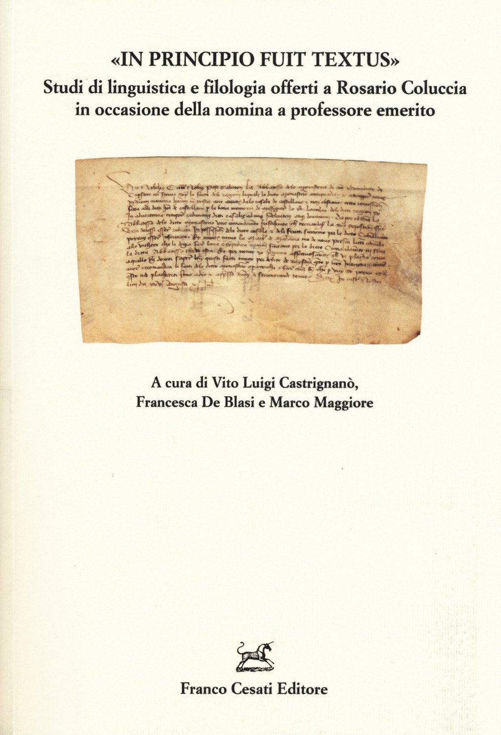 Rosario Coluccia utilizzava spesso questa massima: “In principio fuit textus”, specialmente all’esordio dei propri corsi, come primo invito alla riflessione e come stimolo per forgiare negli studenti i ferri del mestiere, gli strumenti di base del lavoro critico. Il presente volume raccoglie circa cinquanta saggi, preceduti da un contributo di Francesco Sabatini e redatti da alcuni degli studiosi con cui Coluccia ha avuto più frequenti occasioni di collaborazione scientifica nel corso della sua carriera accademica. In un’ampia varietà di temi e problemi, i saggi si dipanano lungo le linee tematiche principali perseguite da Coluccia nella sua produzione scientifica: lo studio dei più antichi testi della nostra tradizione, con particolare riguardo per la lirica, la Scuola poetica siciliana e Dante; i problemi di natura grafica nei testi antichi; la storia linguistica dell’Italia meridionale; la lessicografia e l’etimologia/storia delle parole; lo statuto e la terminologia della disciplina “storia della lingua italiana”; né manca fra le tematiche la lingua contemporanea, che Coluccia ha recentemente esplorato anche al di fuori del circuito accademico, nell’ambito di una rubrica dedicata a questioni linguistiche da lui curata con cadenza settimanale sul Nuovo Quotidiano di Puglia.