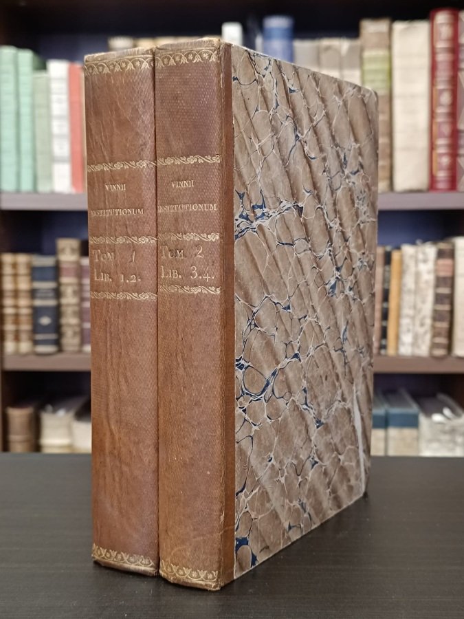 <span style="font-style: normal;">2 volumi in-8° (cm. 23,6), legature di poco successive in mezza pelle nocciola ad angoli, dorsi lisci con titolo e fregi floreali in oro, piatti marmorizzati (lievi tracce d'uso e abrasioni); pp. [16] 998 [38 di </span><i>Index</i>] a numerazione continua, in stato molto buono (lievi fioriture sparse, piccolo difetto all'angolo della sola ultima carta del vol. I senza fastidio; con fregio silografico ai frontespizi con titoli in rosso e nero al vol. I; belle testatine, capilettera e finalini silografici. Edizione non comune veneziana di questo saggio fondamentale sul diritto romano del giurista olandese Arnold Vinnen,&nbsp;curata da Johann Gottlieb Heinecke e stampata per la prima volta nel 1642. Esemplare molto buono. (NA6)