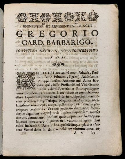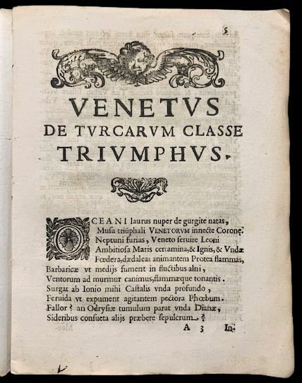 In 4° (22×17 cm); 19, (1) pp. Senza legatura ma nel complesso esemplare in buone condizioni di conservazione. Testatine, finalini xilografici. Dedica al cardinale Gregorio Barbarigo. Prima ed unica edizione, non comune, di questo componimento opera del noto filologo, storico e traduttore lucchese, Giovanni Vincenzo Lucchesini (Lucca, 28 giugno 1660 Roma, 1744). Nato in unantica famiglia patrizia, Giovanni Maria studiò giurisprudenza e matematica a Pisa, frequentando al contempo, le lezioni di letteratura di Adriano Belga e Alessandro Marchetti, questultimo celeberrimo traduttore di Lucrezio. Abilissimo traduttore venne scelto dalla corte pontificia per ricoprire la carica di Segretario delle Lettere Latine del Cardinale Segretario di Stato. Clemente XII, apprezzandolo per il suo continuo ed assiduo lavoro, lo promosse Segretario delle Lettere Latine e dei Brevi ai Principi, Ufficio nel quale venne, poi, confermato anche da Benedetto XIV. La sua opera fu apprezzatissima tanto da ricevere numerose lodi dal Muratori, dal Rollin e dal Gravina. Autore di numerose orazioni di notevole valore, fu autore, anche, di alcune opere storiche di valore come la sua celebre opera dedicata alla storia della Pace di Nimega edita nel 1700. Nel componimento qui presentato celebra le vittorie ottenute dalle armate e dalla flotta delle Serenissima sui turchi. Opera assai rara.