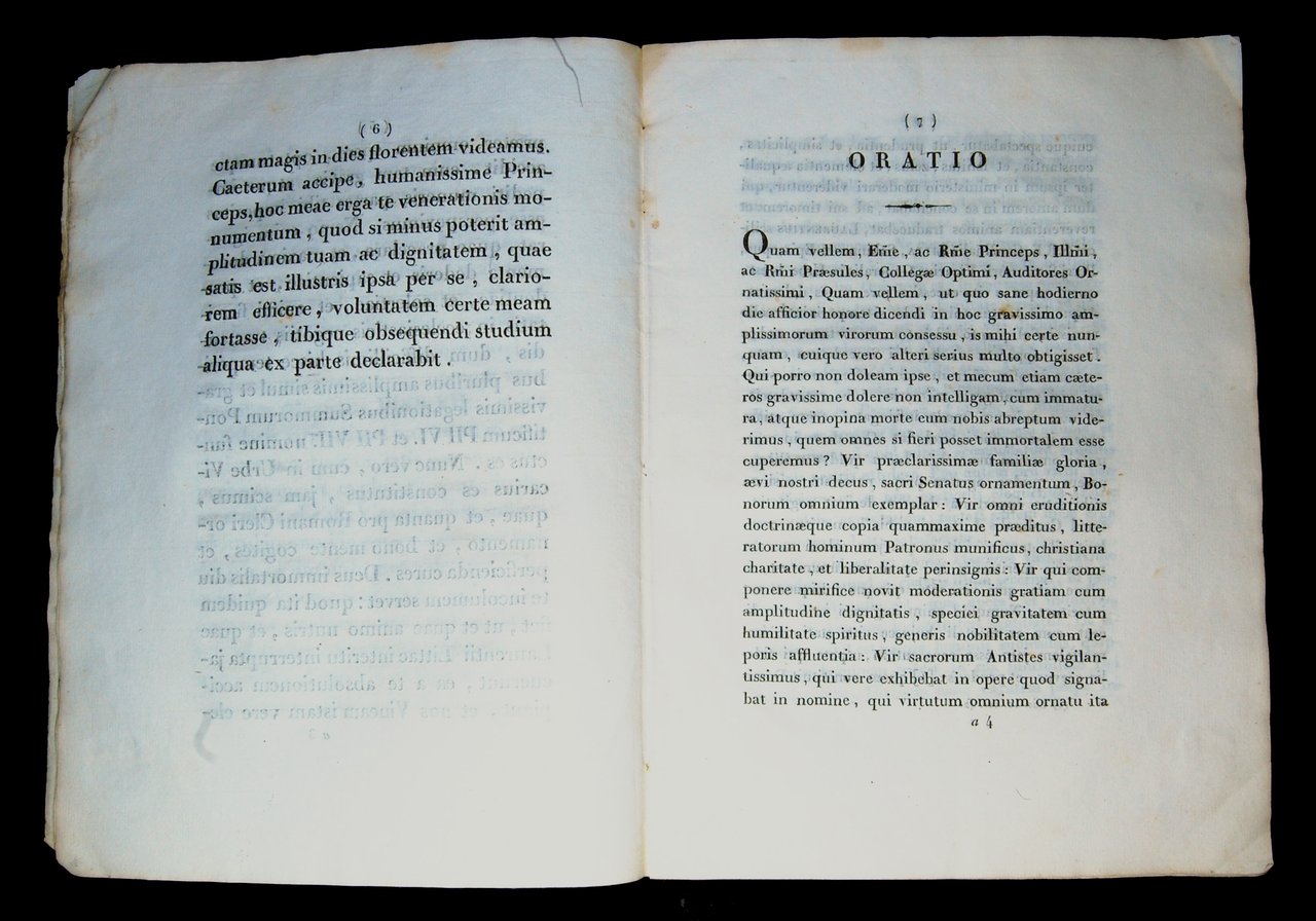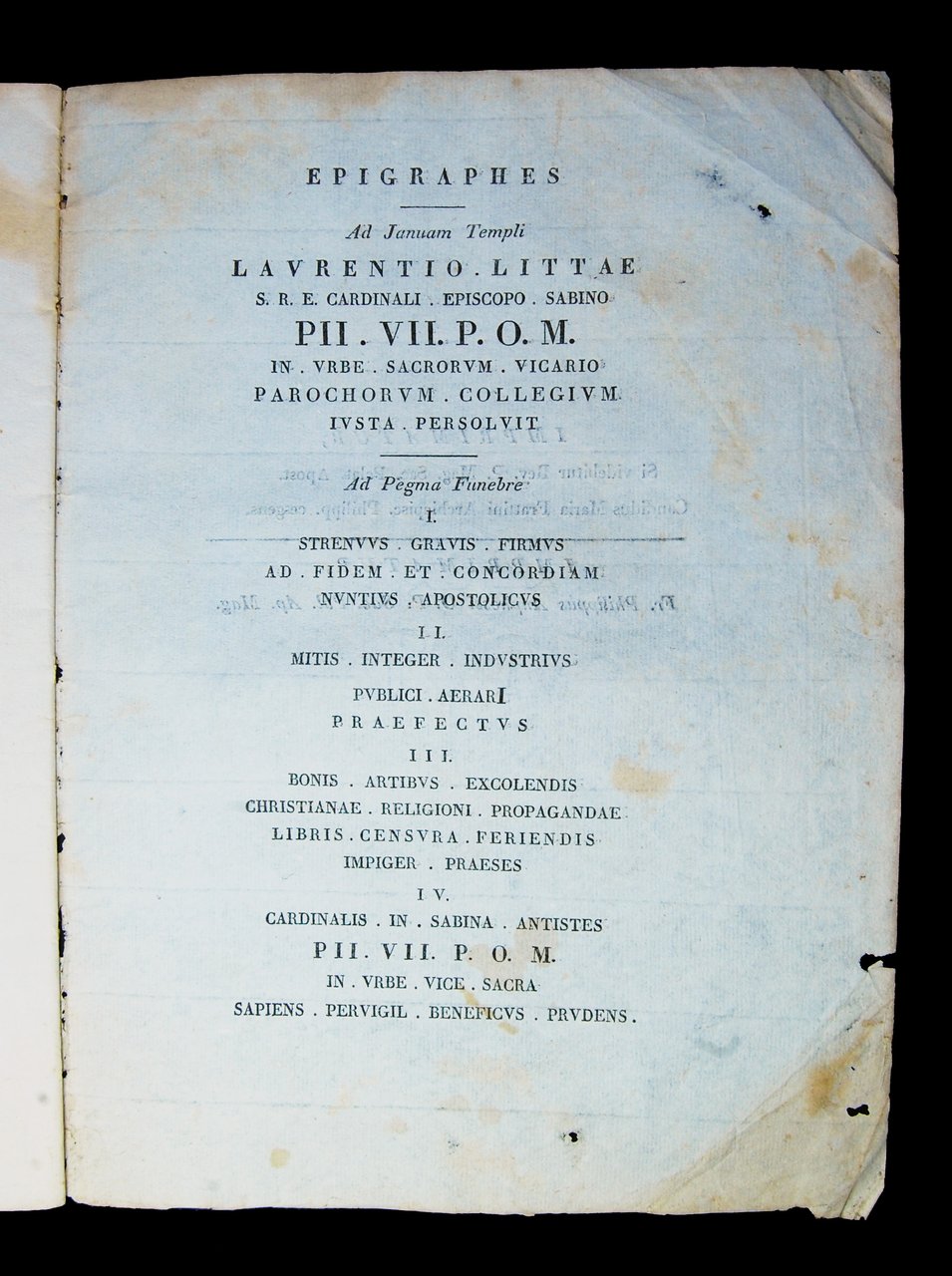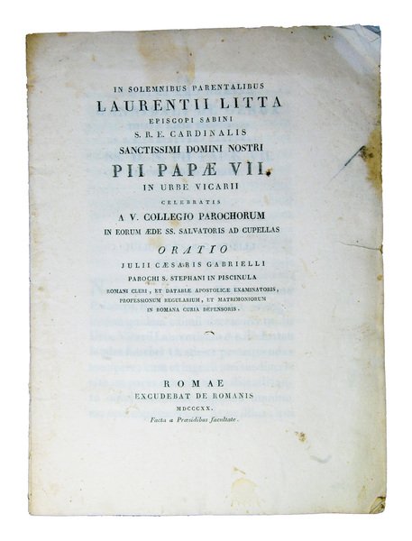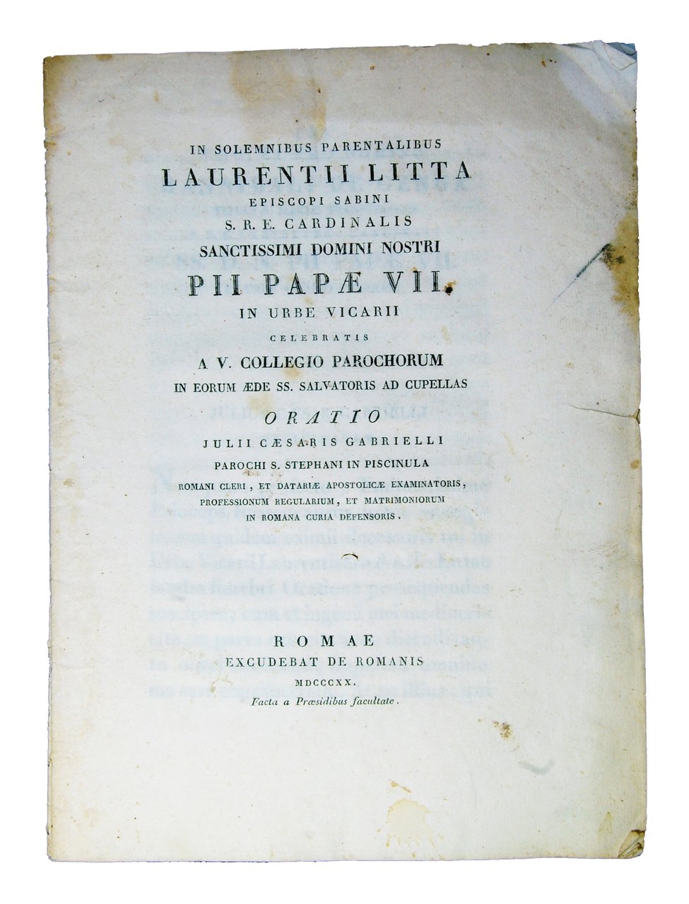 4to (272x200 mm), fascicolo formato da otto bifogli legati in due quaderni con cucitura a filo, il primo bifoglio fa da coperta e frontespizio; pp. 29, (3); front. in b/n; finalino inciso; testo in latino. Rara orazione funebre indirizzata da Giulio Cesare Gabrielli al card. Lorenzo Litta in occasione delle solenni celebrazioni parentali (Parentalia). Le Parentalia (o Parentali) erano delle festività romane, a carattere prevalentemente privato, che si celebravano ogni anno in onore dei defunti della famiglia (Parentes). Le celebrazioni si svolgevano nel mese di febbraio dalle idi (13 febbraio) al 21 febbraio, giorno riservato alla celebrazione delle feralia, la vera e propria festa dei morti. Si credeva in tal giorno che le anime dei defunti potessero girare liberamente tra i vivi. Lorenzo Litta Visconti Arese (1756-1820) è stato un cardinale italiano, Vescovo di Sabina dal 26 settembre 1814 al 1º maggio 1820. Rif.: IT\ICCU\RAVE\005999 (due esemplari). Cond.: Segni d'uso e macchie ad alcune carte; in buone condizioni generali. -- RARE FUNERAL ORATION ADDRESSED BY GIULIO CESARE GABRIELLI (SEC. 19) TO THE CARD. LORENZO LITTA ON THE OCCASION OF THE SOLEMN PARENTAL CELEBRATIONS (PARENTALIA) IN 1820. In ancient Rome, the Parentalia, or dies parentales ("ancestral days"), was a nine-day festival held in honor of family ancestors, beginning February 13 and concluding February 21 in the midnight rites of Feralia. Traces of use and spots at some leaves; in good condition.