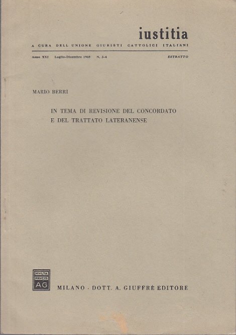 In-8 (Cm 24 x 17), pp. da 296 a 311, brossura editoriale. Estratto da Iustitia 1968. Lieve brunitura diffusa. BUONO