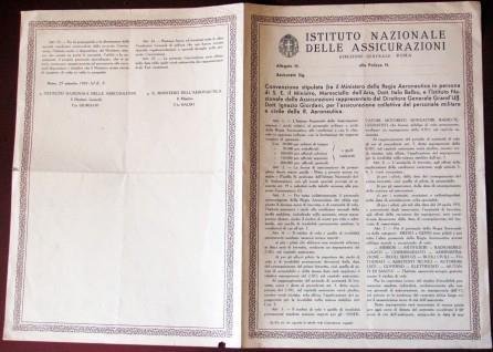 Convenzione stipulata fra il Ministero della regia Aeronautica in persona di S. E. il Ministro, Maresciallo dell'Aria, Dott. Italo Balbo, e l'Istituto Nazionale delle Assicurazioni, rappresentato dal Direttore Generale Grand'Uff. Dott. Ignazio Giordani, per l'assicurazione collettiva del personale militare e civile della R. Aeronautica. Documento con piccolissima mancanza, come da foto, in basso all'ultima pagina. 23,5x33,5; pp.4. Buonissimo stato. , Buono (Good)