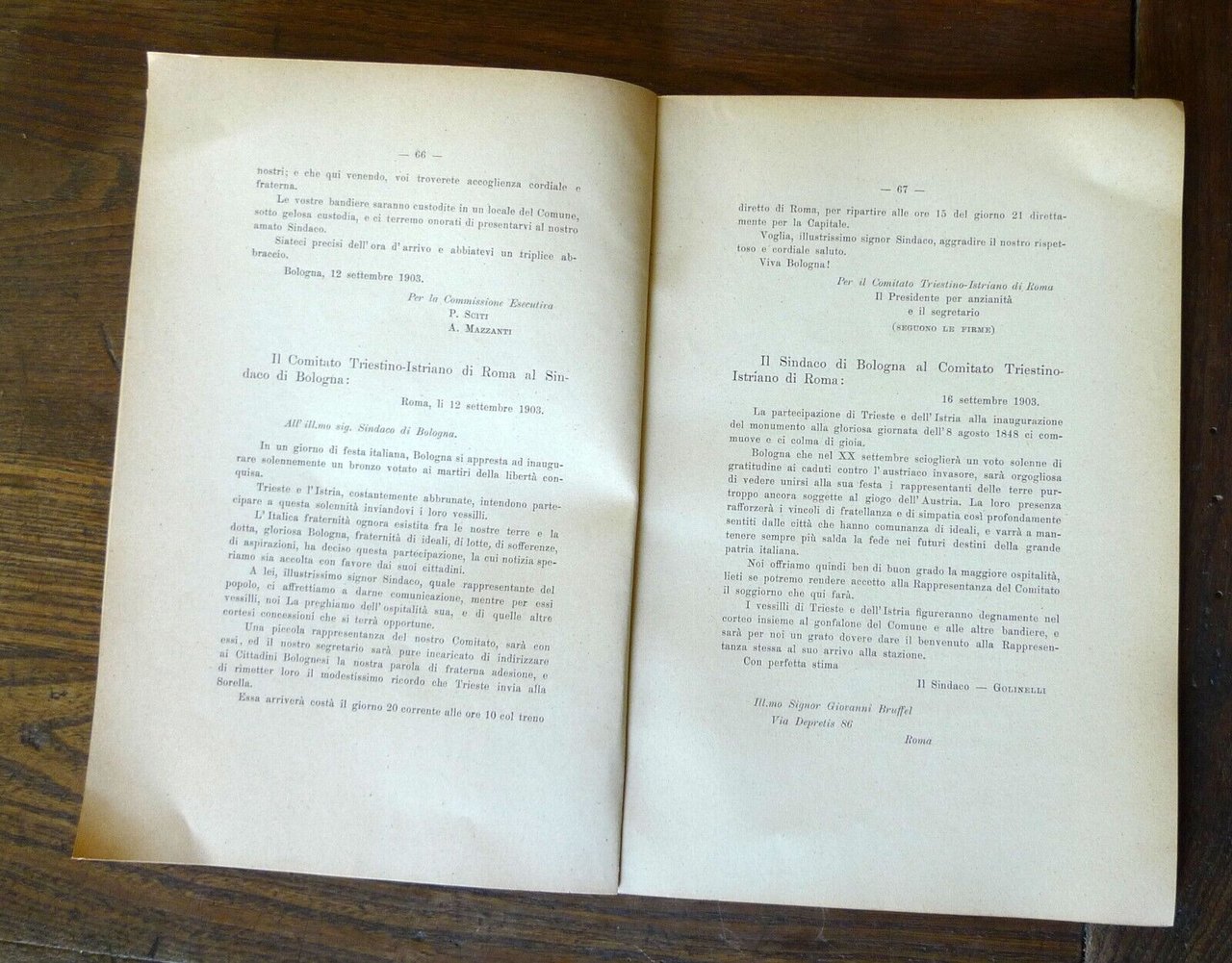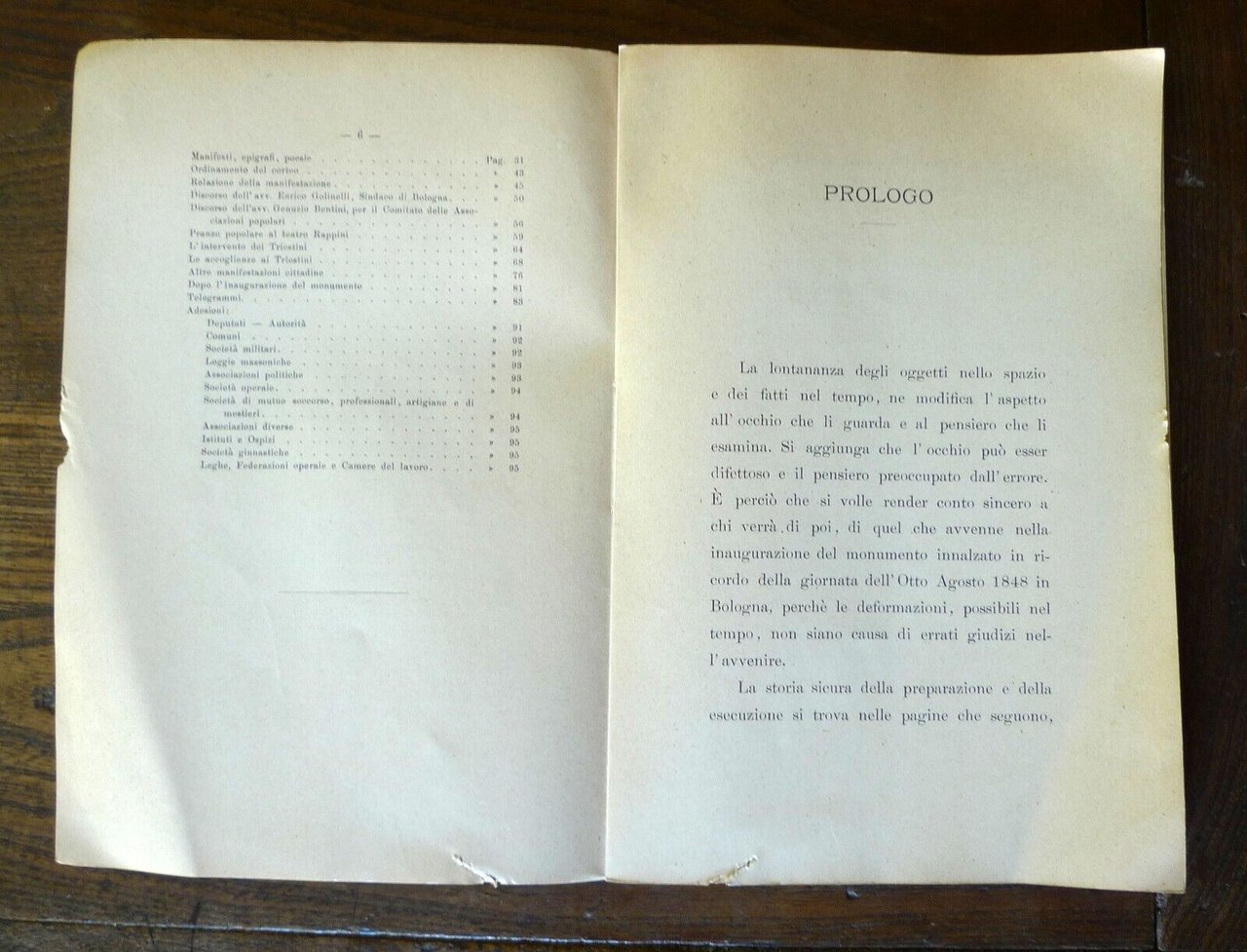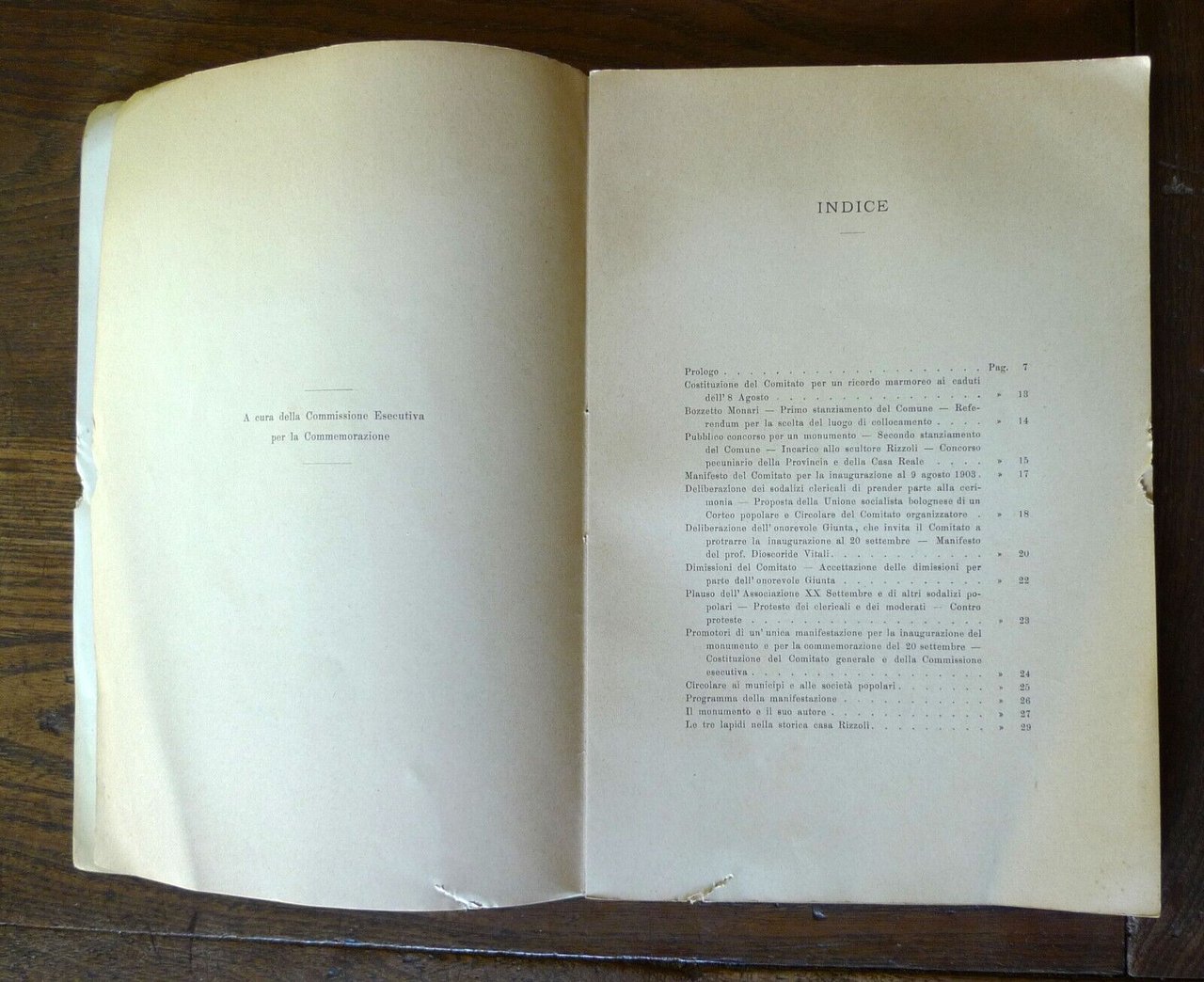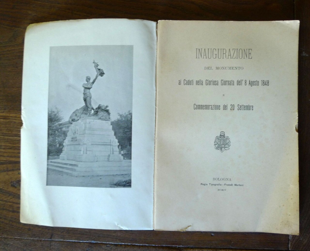 INAUGURAZIONE DEL MONUMENTOAI CADUTI NELLA GLORIOSA GIORNATADELL'8 AGOSTO 1848.COMMEMORAZIONE DEL 20 SETTEMBRE.Bologna, Regia Tipografia - Fratelli Merlani,MCMIV (1904),brossura, 24x16 cm., pp.96,con una illustrazione all'antiporta,peso: g.300