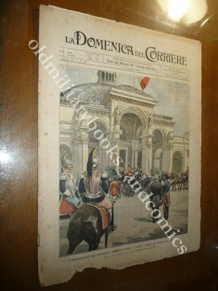"DESCRIZIONE: Domenica del Corriere, Anno II n. 20 (20 maggio 1900). COPERTINA: L'inaugurazione dell'Esposizione Nazionale d'Igiene a Napoli: l'arrivo dei sovrani aal'Auditorium. RETRO: Un battesimo "Fine de Siecle" a Modena: il bambino Washington ed il corteo ciclistico all'uscita dal Duomo. La Domenica del Corriere è stato un popolare settimanale italiano fondato a Milano nel 1899 e chiuso nel 1989. Apparve per la prima volta nelle edicole l'8 gennaio 1899 come supplemento illustrato del Corriere della Sera. Stampata in grande formato (sul modello del domenicale La Tribuna illustrata), aveva 12 pagine e veniva distribuita gratis agli abbonati del Corriere, oppure si poteva acquistare in edicola per 10 centesimi. La prima e ultima di copertina erano sempre disegnate. Il Corriere si avvaleva di un giovane disegnatore, Achille Beltrame, allora sconosciuto, a cui veniva affidato in ogni numero il compito di rendere con la sua tavola il fatto più interessante della settimana. Dopo la sua morte nel 1945, fu sostituito da Walter Molino che, come il suo predecessore, firmò memorabili copertine. A differenza dei settimanali dell'epoca, la Domenica del Corriere diede ampio spazio alle fotografie e ai disegni, e questo fu uno dei motivi del suo successo. CONDIZIONI: Discrete, senza azzurrina, proveniente da rilegatura, mancanza alla parte bassa della rivista. PESO / WEIGHT: 100 gr. without package"