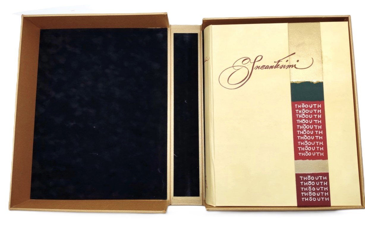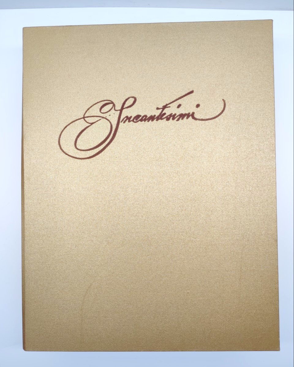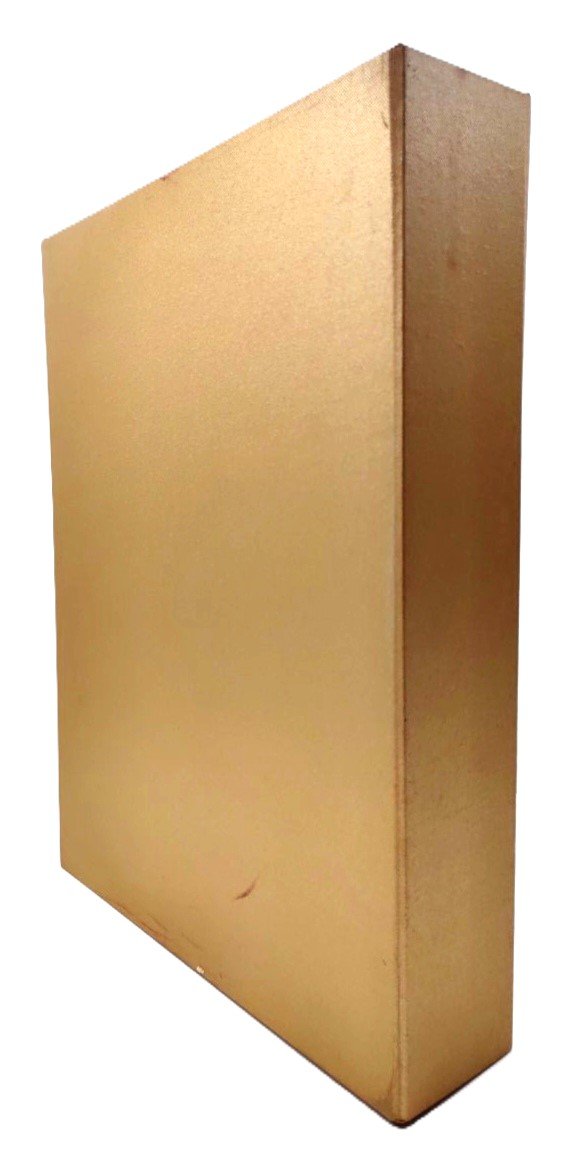 Cofanetto rigido editoriale in tela color oro, rivestito in velluto nero, legatura rigida in pelle di pregio con inserti al piatto anteriori, in una busta targa per dedica del volume non incisa, interno in buono stato, dimensioni cm 43,8 * 34 * 8