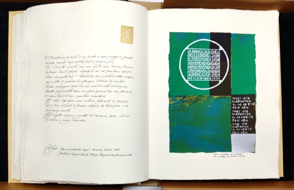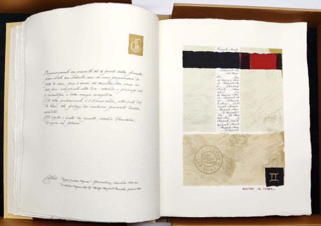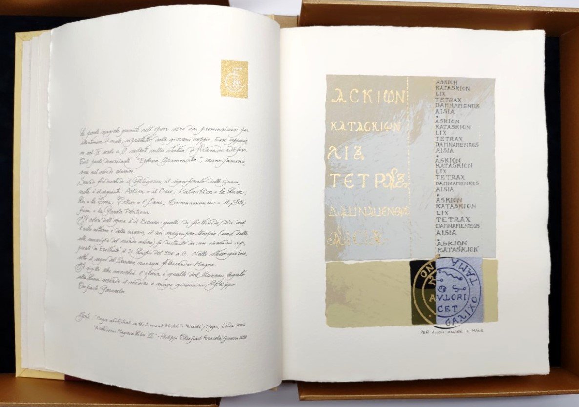 La collezione originale comprende 49 opere stampate su carta inglese a mano della dimensione di un foglio 30 x 20, illustrate con tecnica mista (olio, inchiostri colorati, pastelli ad olio, vernici metalliche e foglia d'oro) ed ispirate dagli incantesimi del mondo antico. Il lavoro filologico che ha accompagnato la creazione artistica ha comportato un accurato studio dei "papiri magici" d'origine egiziana, greca e latina (datati dal III secolo a.C. al IV d.C.); delle opere dei grandi maghi del Medio Evo e del Rinascimento (Paracelso, Dee, Agrippa, Alberto Magno) e dei testi fondamentali della tradizione ermetica anche ebraica ed araba. Le formule antiche e le connessioni esoteriche codificate sono state interpretate ed adattate con levità alla realtà attuale, anche perché l'antica pratica accettava la possibilità di contemperare l'ortodossia con la libera ispirazione del mago; ciò che tra l'altro è d'ausilio alla necessaria indipendenza di interpretazione del lettore.
