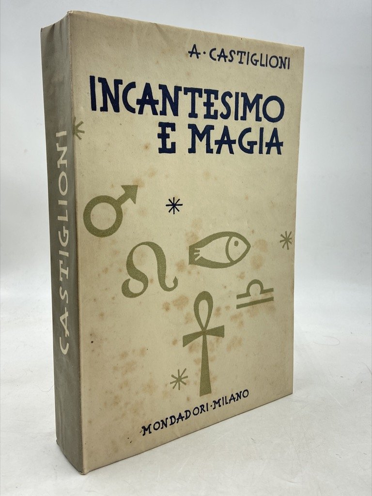 Brossura editoriale illustrata, cm 23 x 15, pp 468 (4), 75 illustrazioni in nero fuori testo. Arrossamenti sulla brossura, ottimo l'interno. Pioniere della storiografia medica, già nella sua opera più celebre, la Storia della Medicina del 1927 (più volte aggiornata e tradotta in varie lingue), Arturo Castiglioni dimostrava l'interesse per l'intreccio tra l'evolversi della scienza medica e la cultura generale, la filosofia, la superstizione. Nel 1934 diede alle stampe questo interessante e scorrevole saggio sulla magia, il misticismo e la superstizione, anche nei loro rapporti con la scienza, dalle civiltà antiche all'epoca contemporanea. L'opera, «frutto di una vasta e varia cultura, e certamente anche del retroterra culturale viennese e triestino» (DBI) riprende temi di Freud, Jung, Frazer e analizza il pensiero magico nelle sue forme pratiche e teoriche (divinazione, cabala, astrologia, alchimia, spiritismo, magia terapeutica) presso le civiltà babilonese, egizia, greca, romana, etrusca, ebraica, cinese, e nella cultura europea attraverso Medioevo e Rinascimento fino alla modernità. Edizione originale, apparsa nel 1934, lo stesso anno in cui Castiglioni curò la voce Medicina nell'Enciclopedia Italiana, e poco prima di trasferirsi negli Stati Uniti a causa delle leggi razziali, lasciando la cattedra di Storia della Medicina di Padova per quella di Yale.